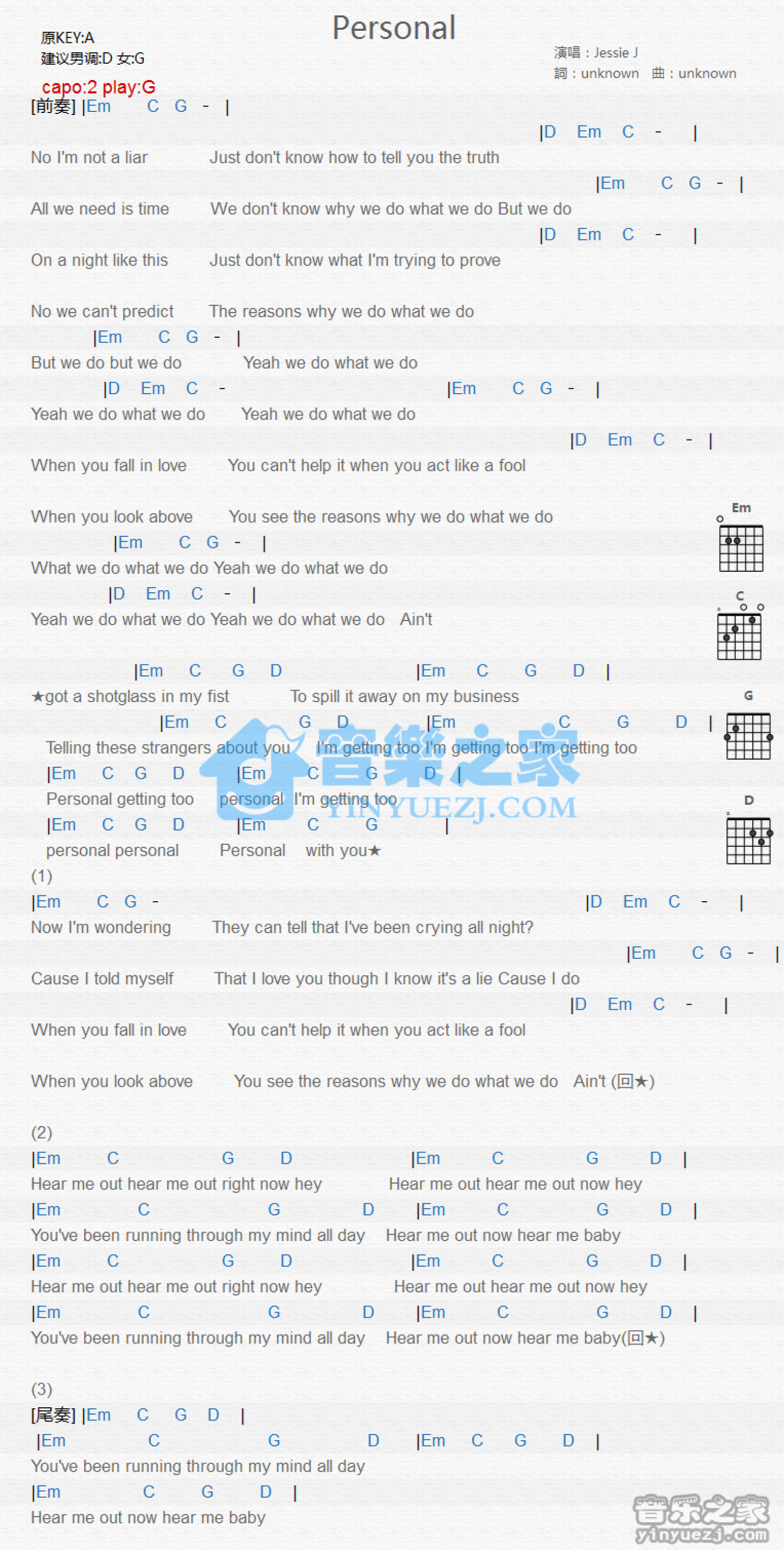 曲谱介绍: G调版《Personal》吉他和弦弹唱谱