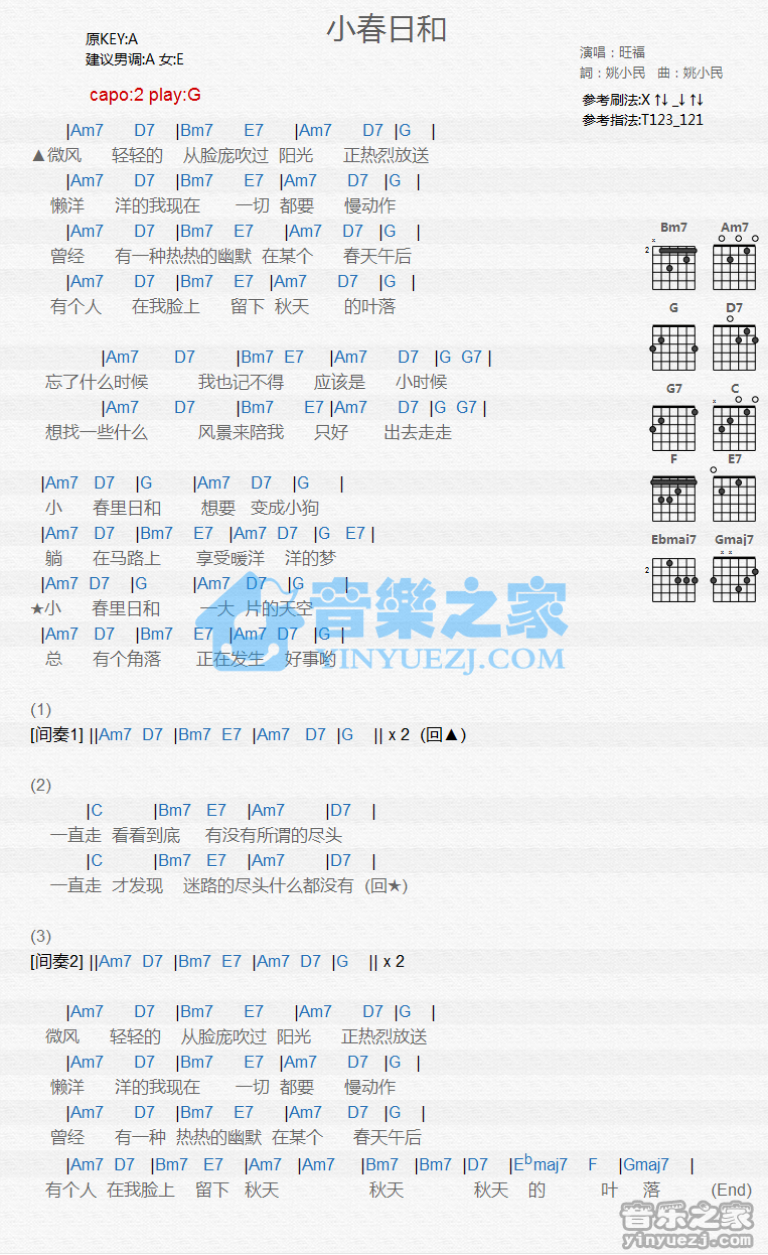 曲谱介绍: G调版《小春日和》吉他和弦弹唱谱