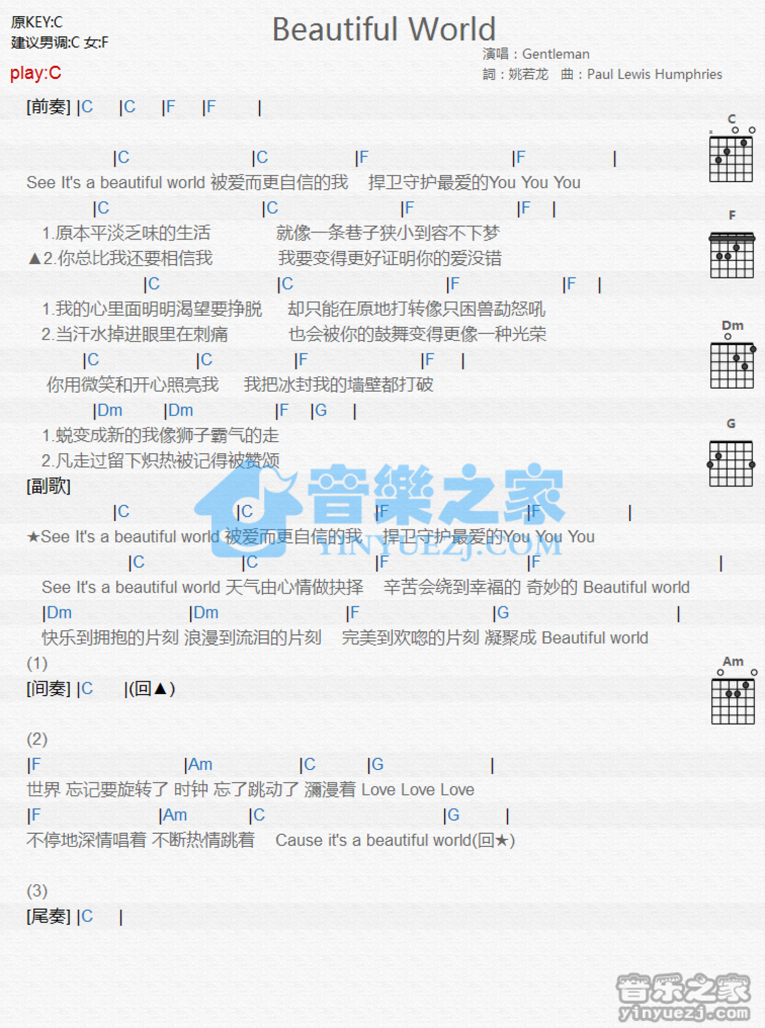 Beautiful World吉他谱 - Gentleman - C调吉他弹唱谱 - 和弦谱