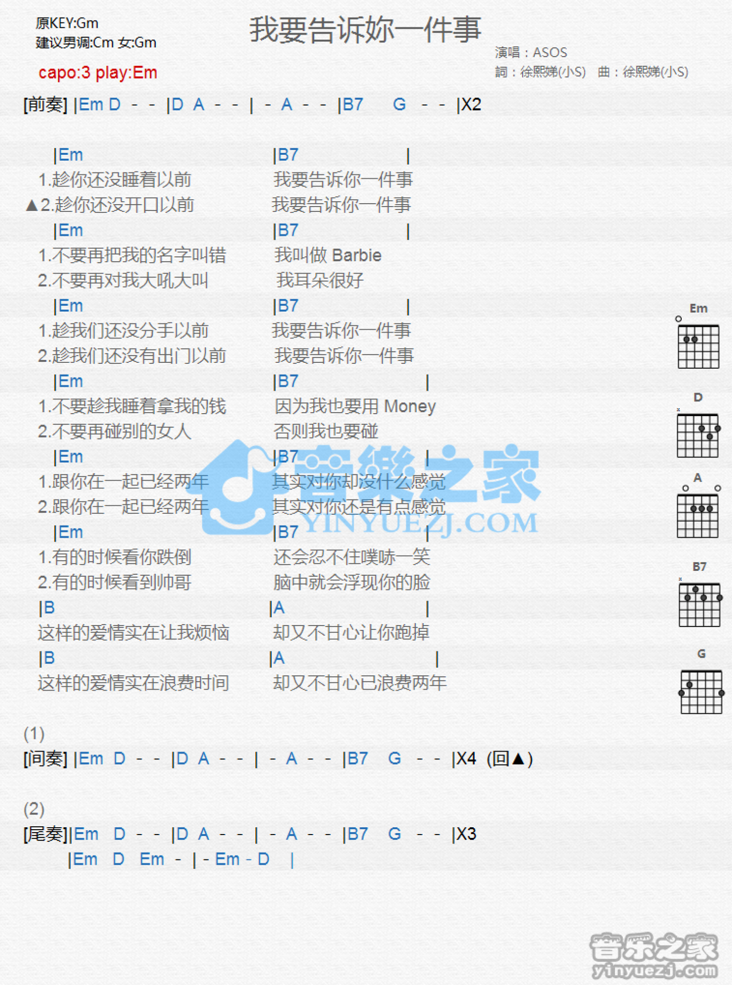 曲谱介绍: Em调版《我要告诉你一件事》吉他和弦弹唱谱