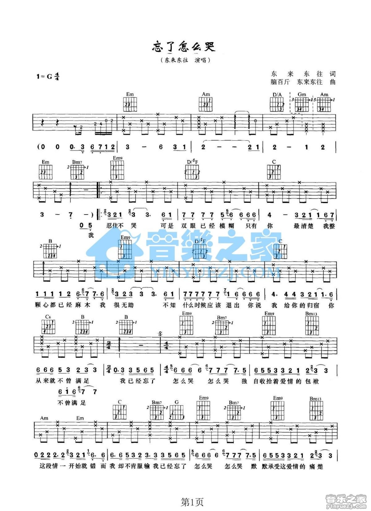 忘了怎么哭吉他谱 - 东来东往 - G调吉他弹唱谱 - 双吉他版
