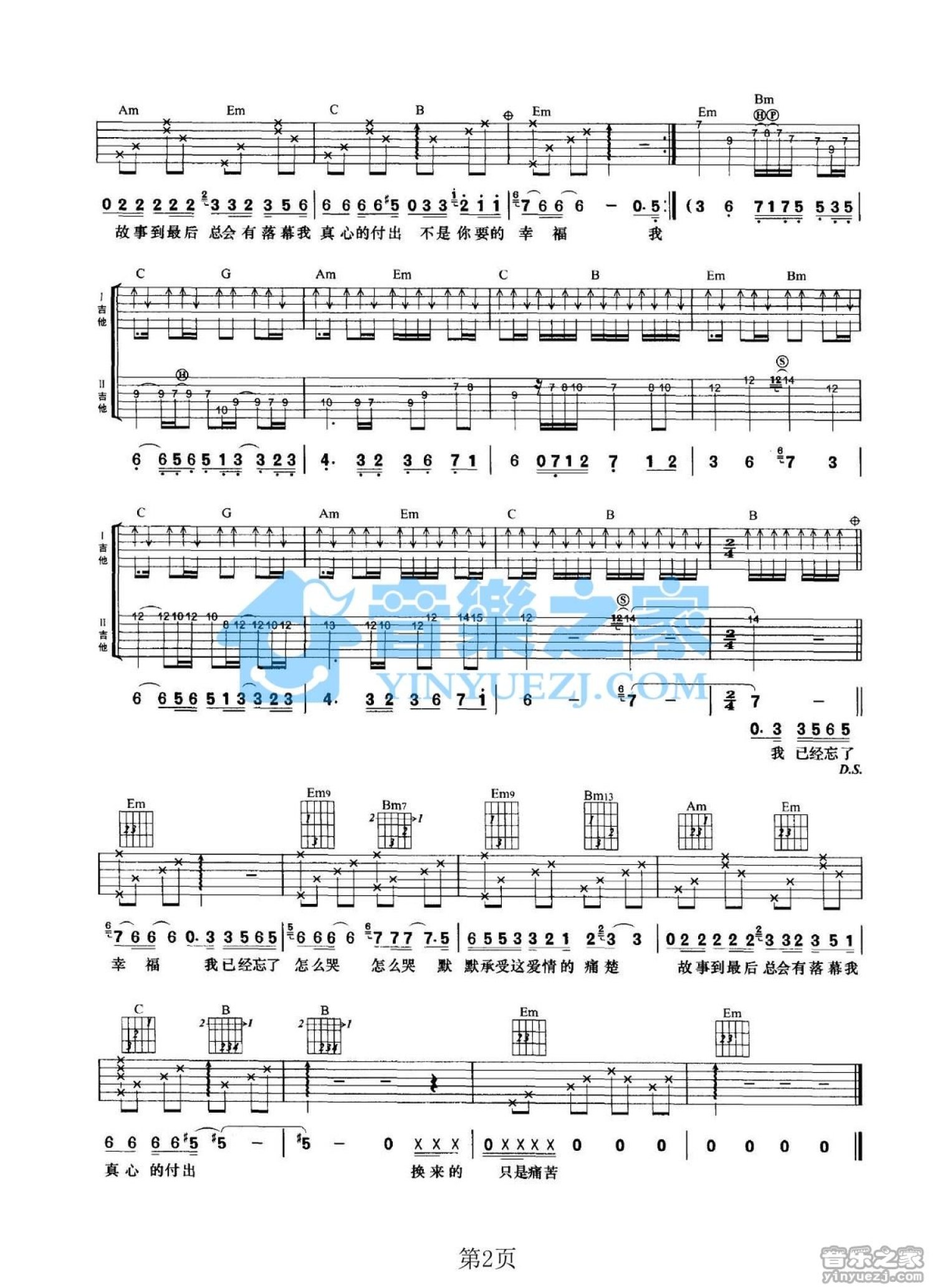 曲谱介绍: G调《忘了怎么哭》吉他弹唱六线谱