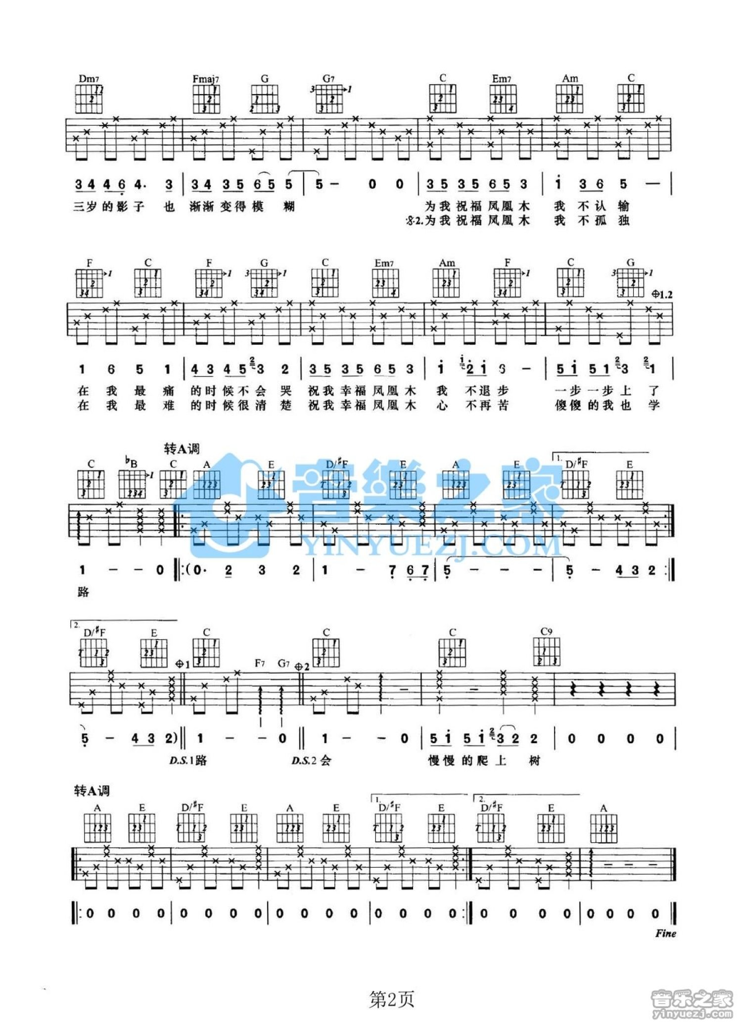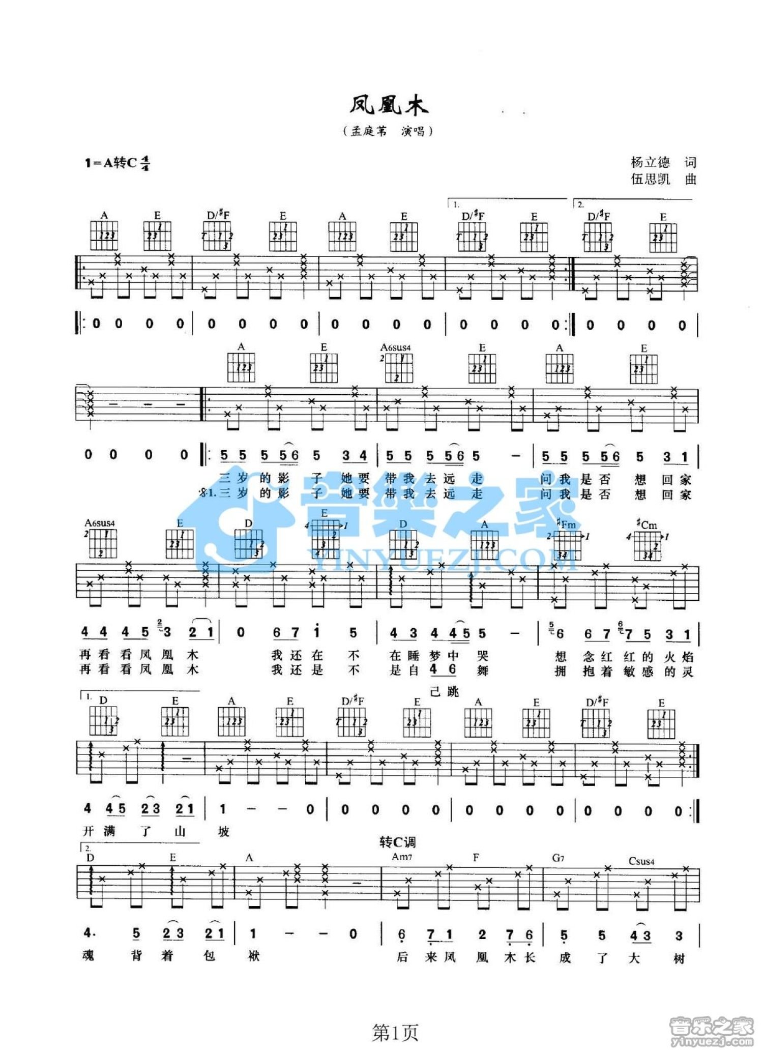 曲谱介绍: A转C调版《凤凰木》吉他弹唱六线谱