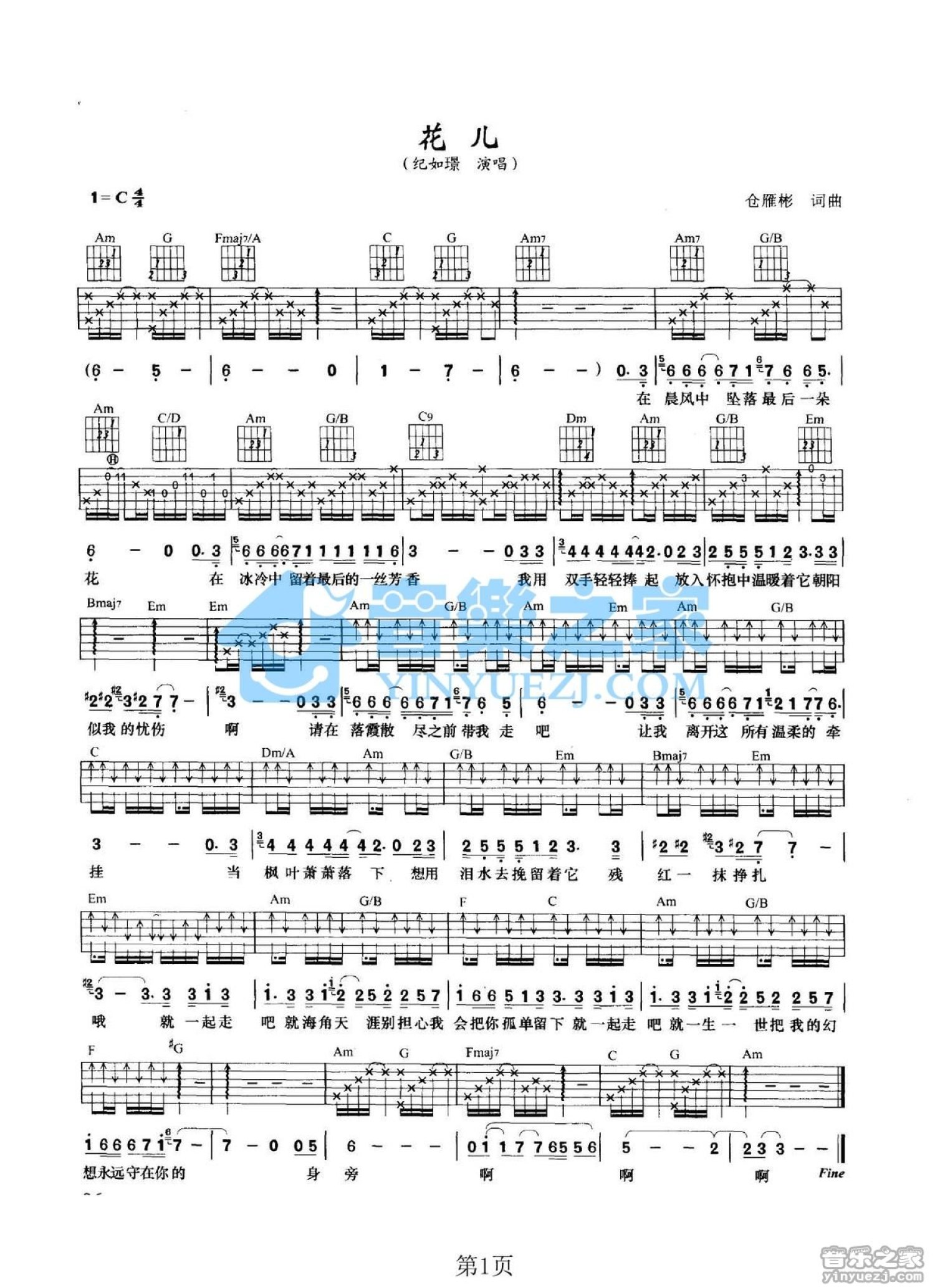 曲谱介绍: C调版纪如璟《花儿》吉他弹唱六线谱