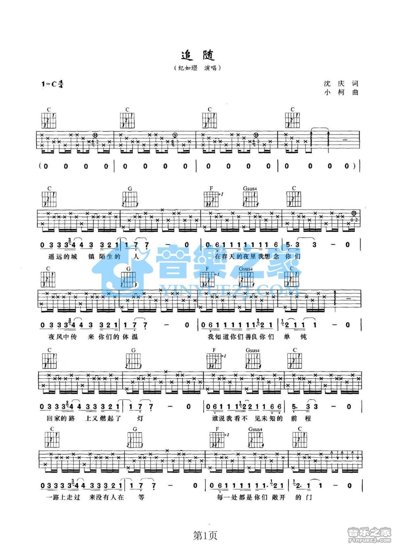 曲谱介绍: C调版纪如璟《追随》吉他弹唱六线谱