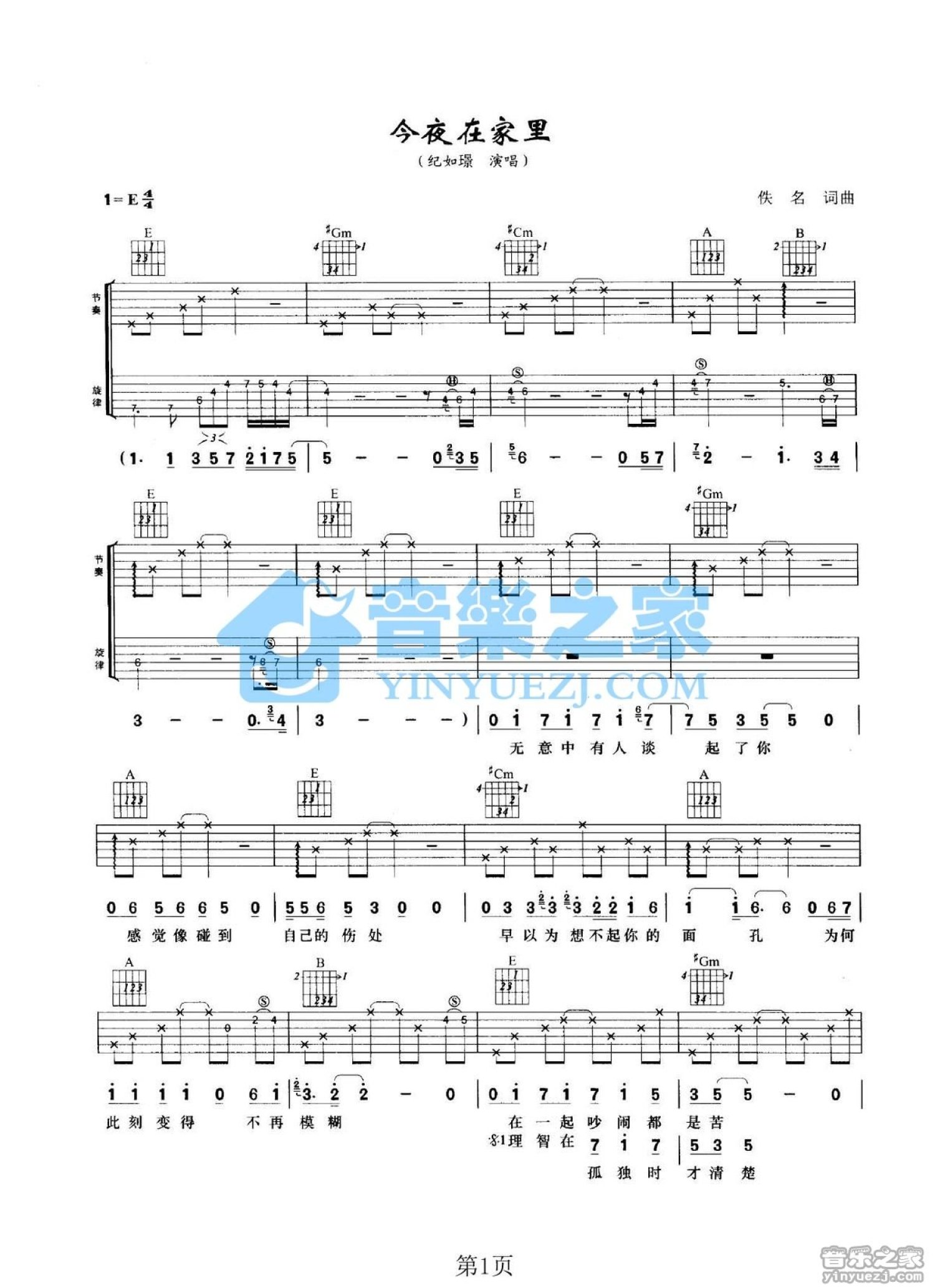 曲谱介绍: E调双吉他版纪如璟《今夜在家里》吉他弹唱六线谱
