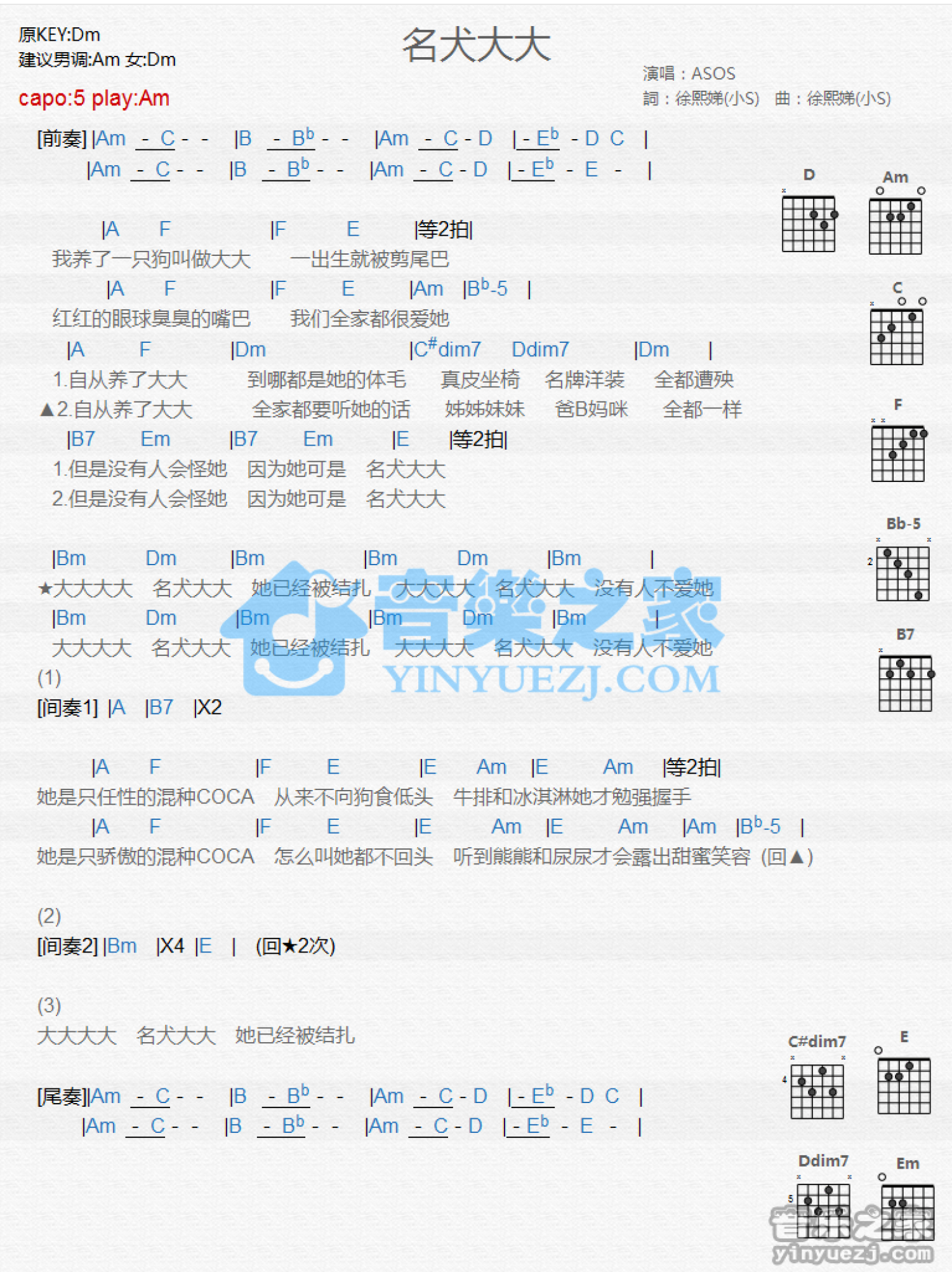曲谱介绍: Am调版《名犬大大》吉他和弦弹唱谱
