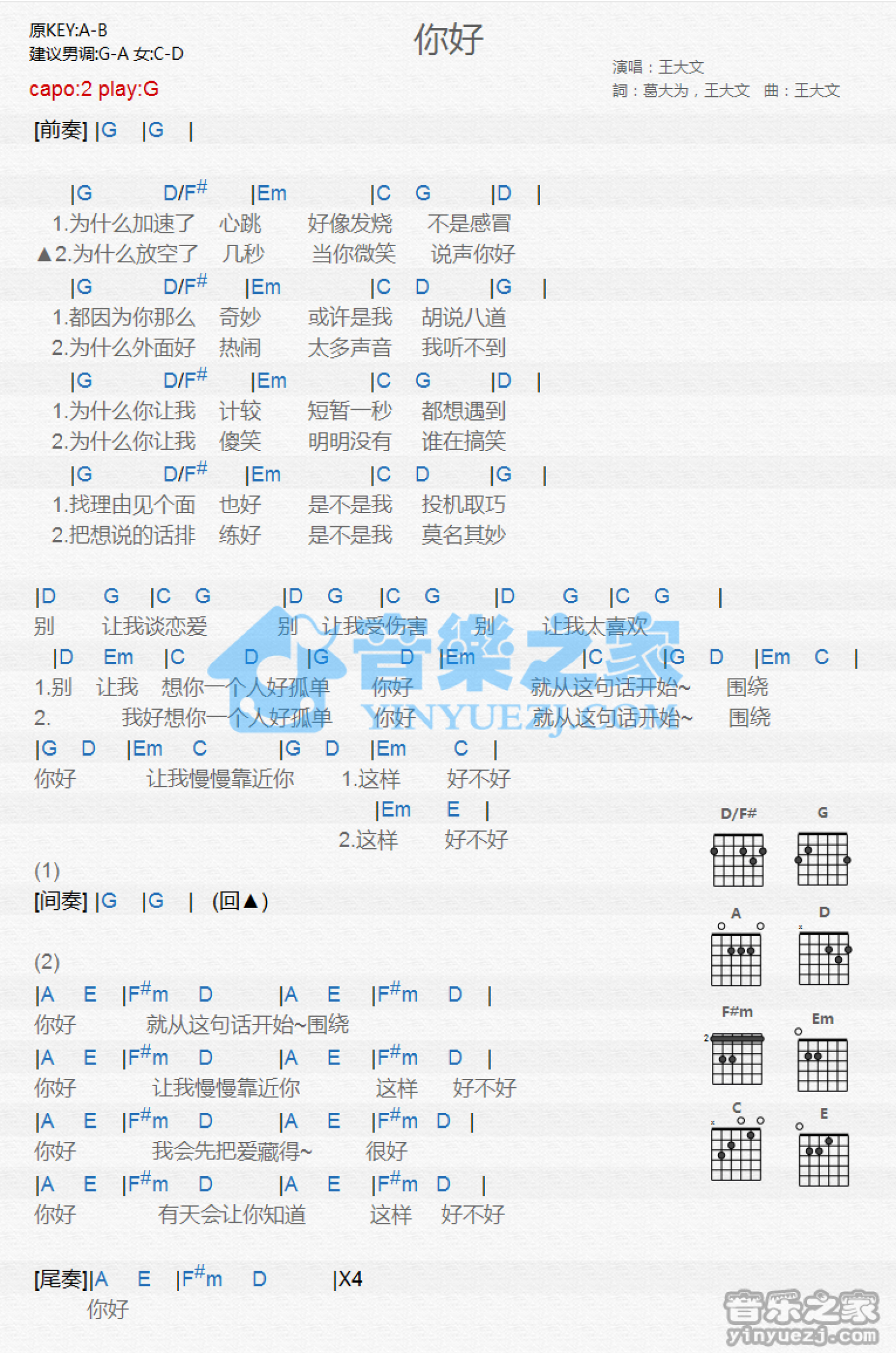 曲谱介绍: G调版《你好》吉他和弦弹唱谱