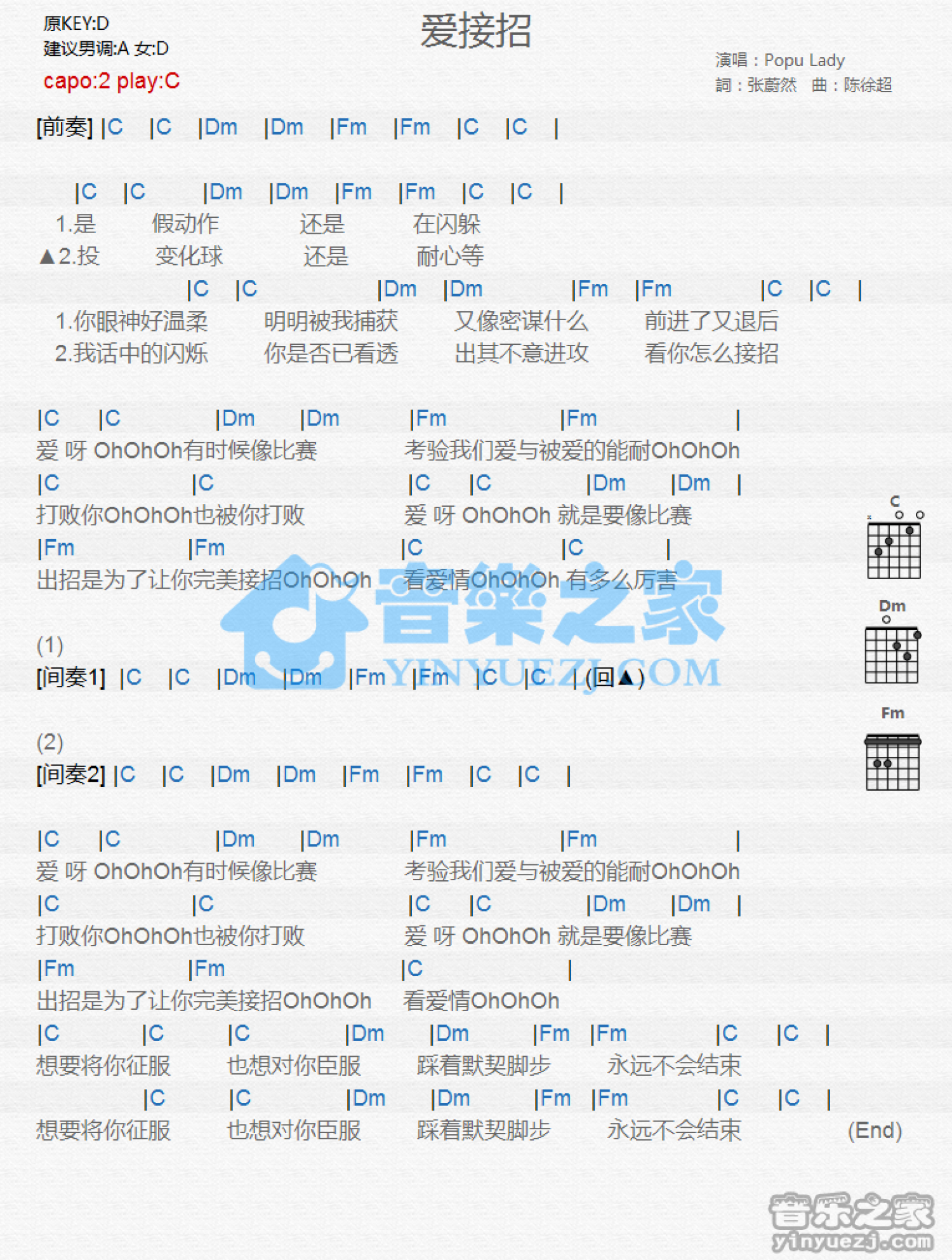 爱接招吉他谱 - PopuLady - C调吉他弹唱谱 - 和弦谱