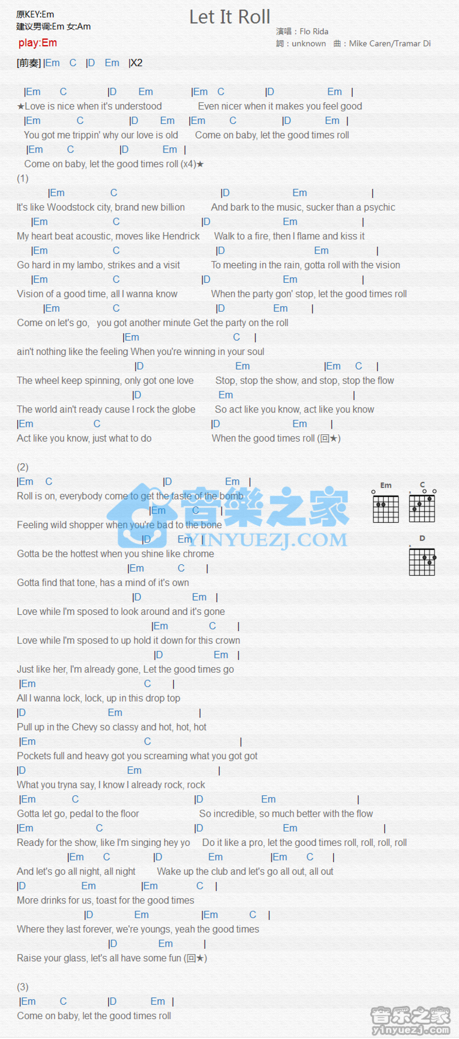 曲谱介绍: Em调版《LetItRoll》吉他和弦弹唱谱