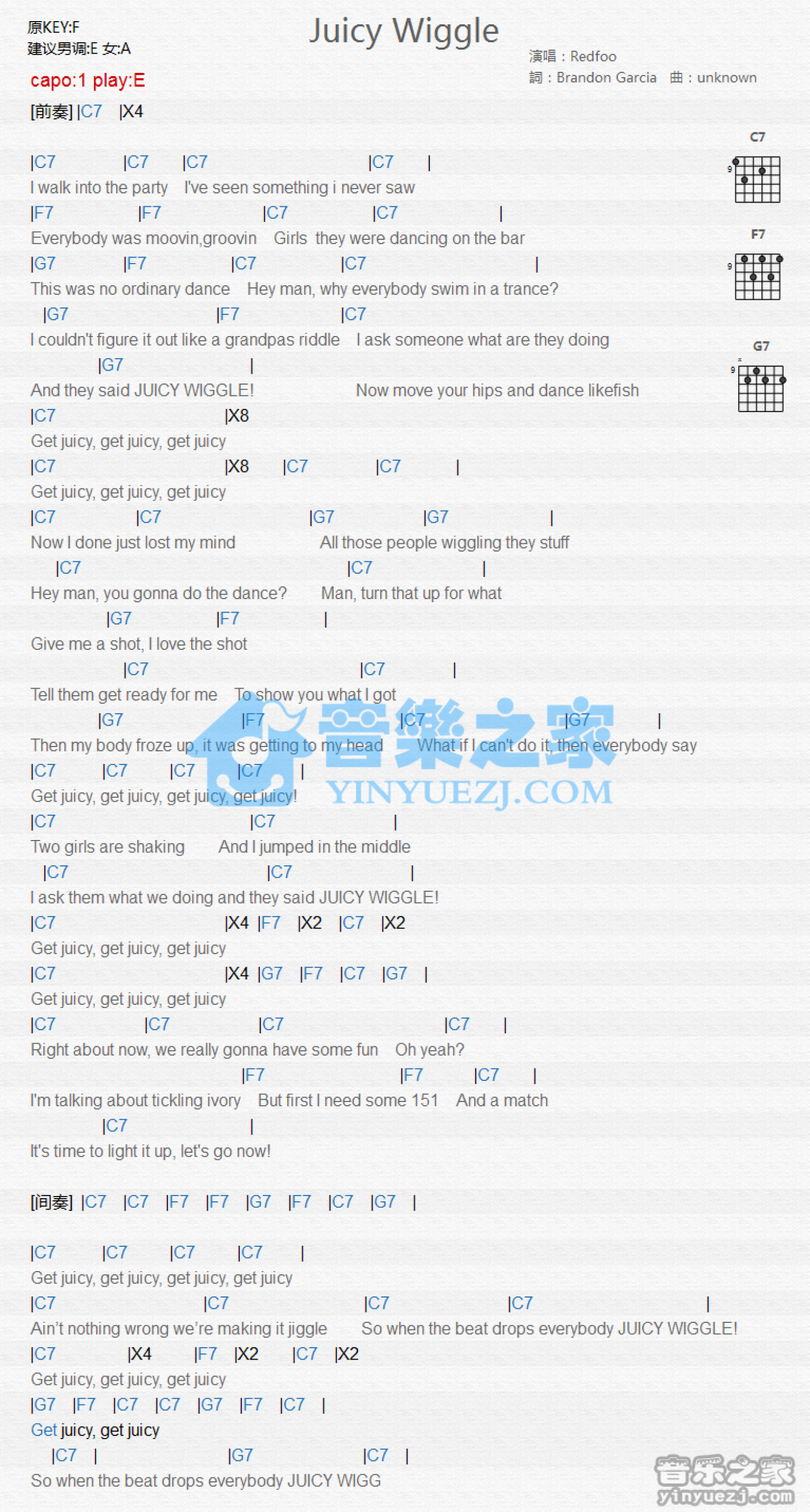曲谱介绍: E调版《JuicyWiggle》吉他和弦弹唱谱