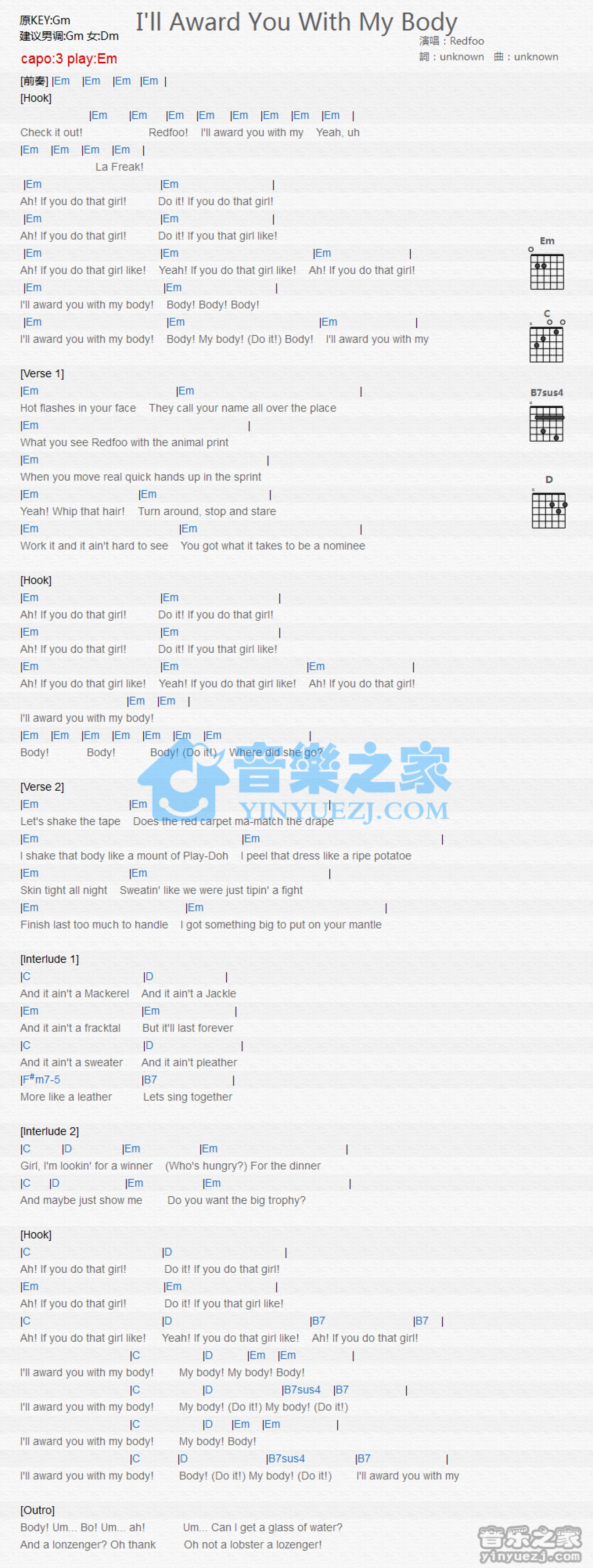 曲谱介绍: Em调版《I'llAwardYouWithMyBody》吉他和弦弹唱谱