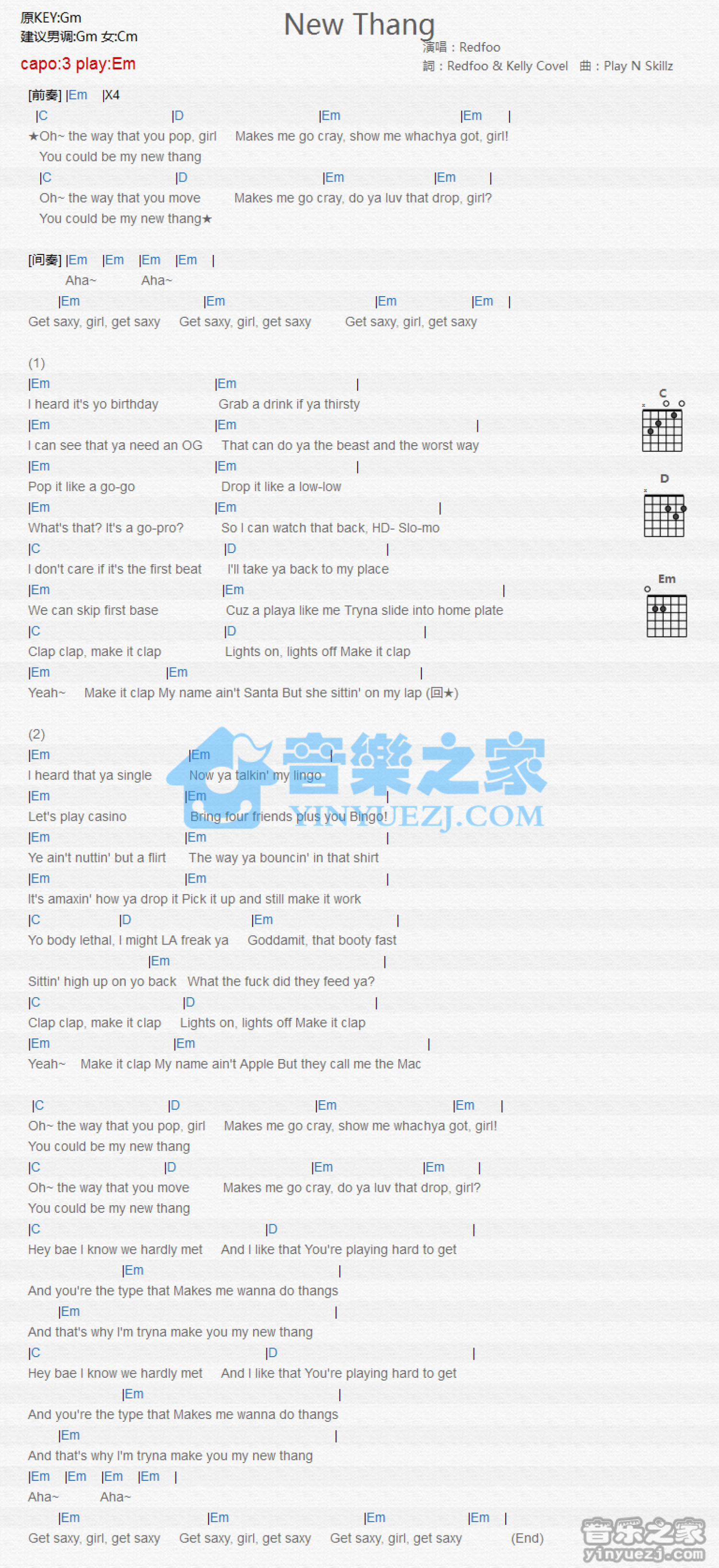 曲谱介绍: Em调版《NewThang》吉他和弦弹唱谱