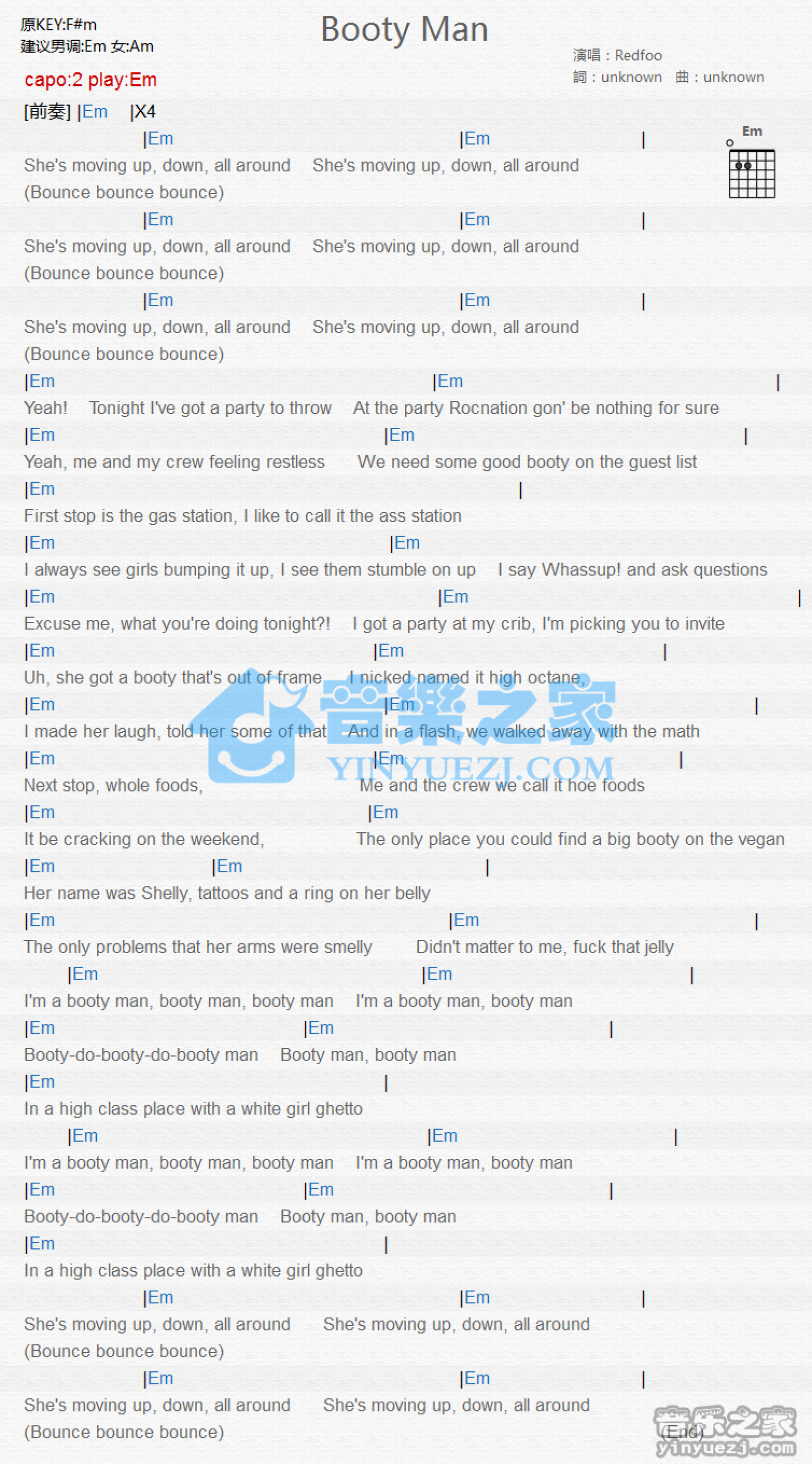 曲谱介绍: Em调版《BootyMan》吉他和弦弹唱谱