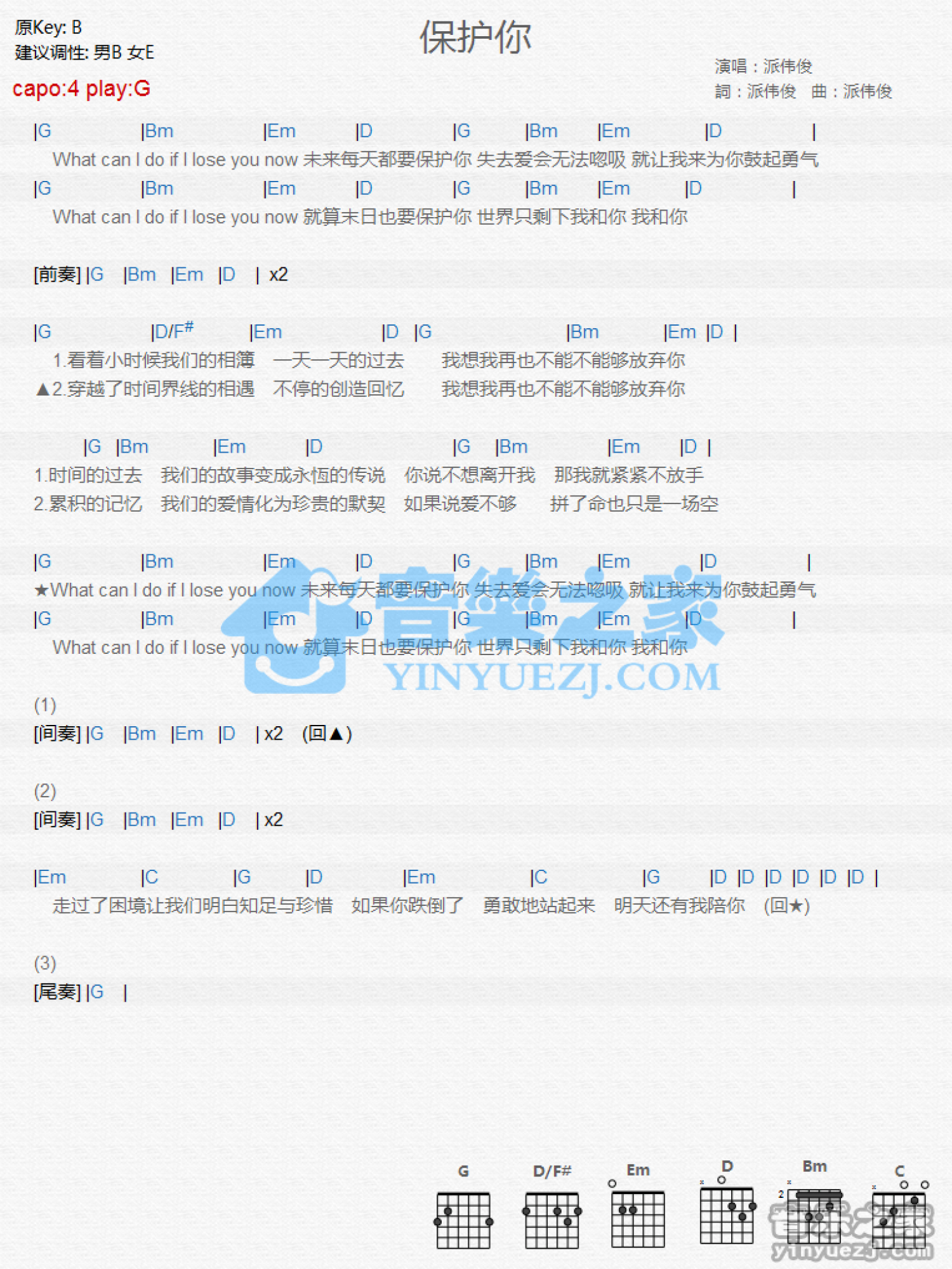 曲谱介绍: G调版《保护你》吉他和弦弹唱谱