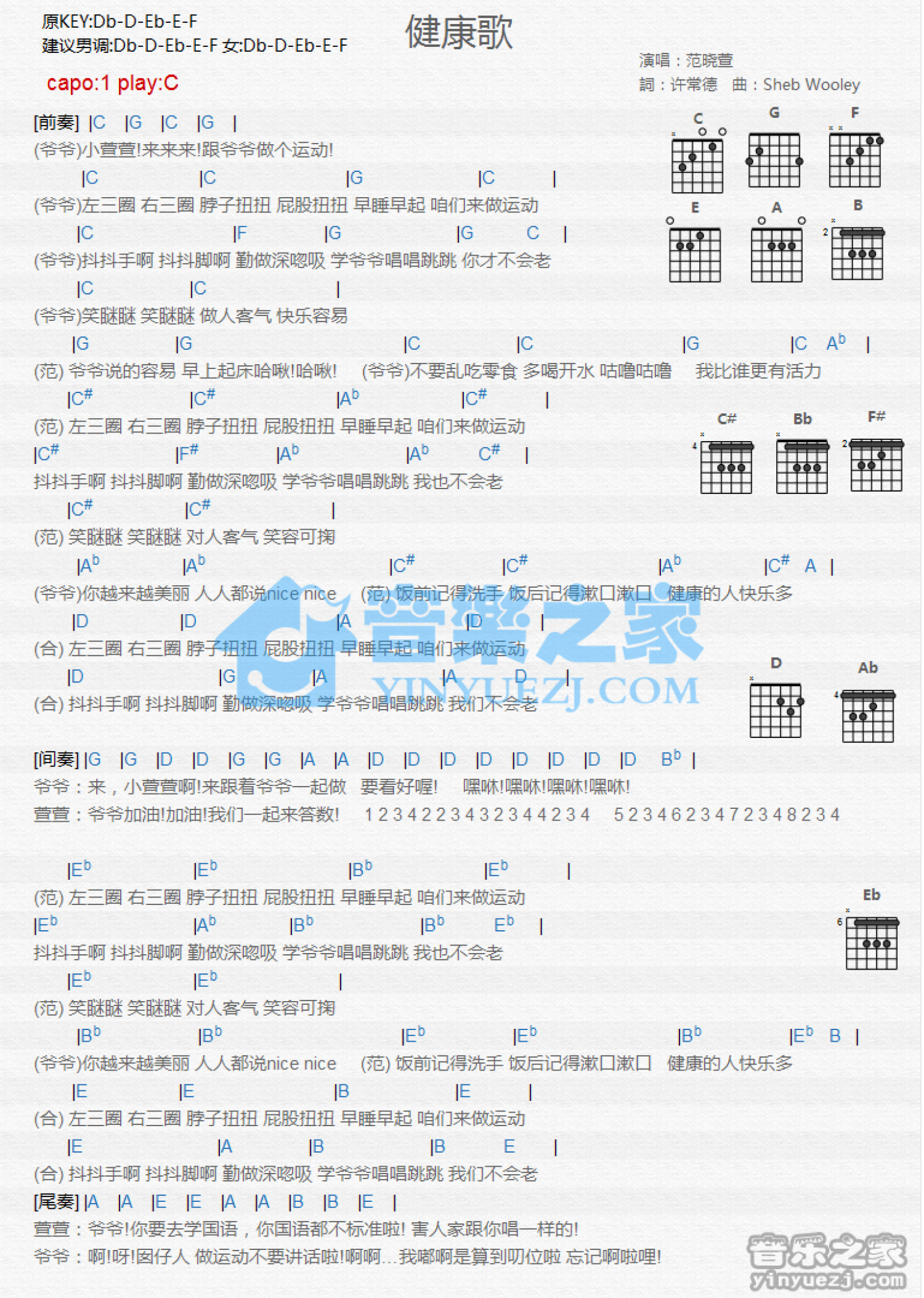 曲谱介绍: C调版《健康歌》吉他和弦弹唱谱