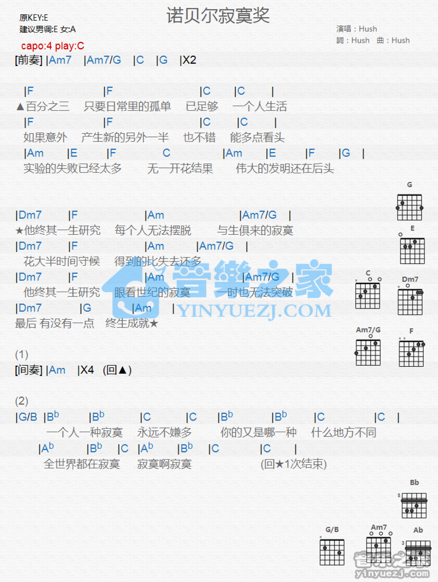 曲谱介绍: C调版《诺贝尔寂寞奖》吉他和弦弹唱谱