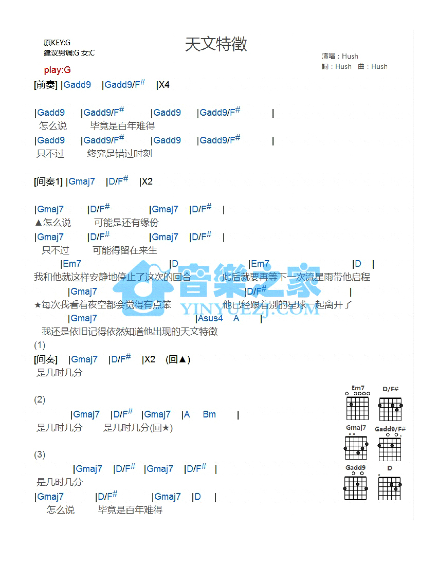 天文特征吉他谱 - Hush - G调吉他弹唱谱 - 和弦谱