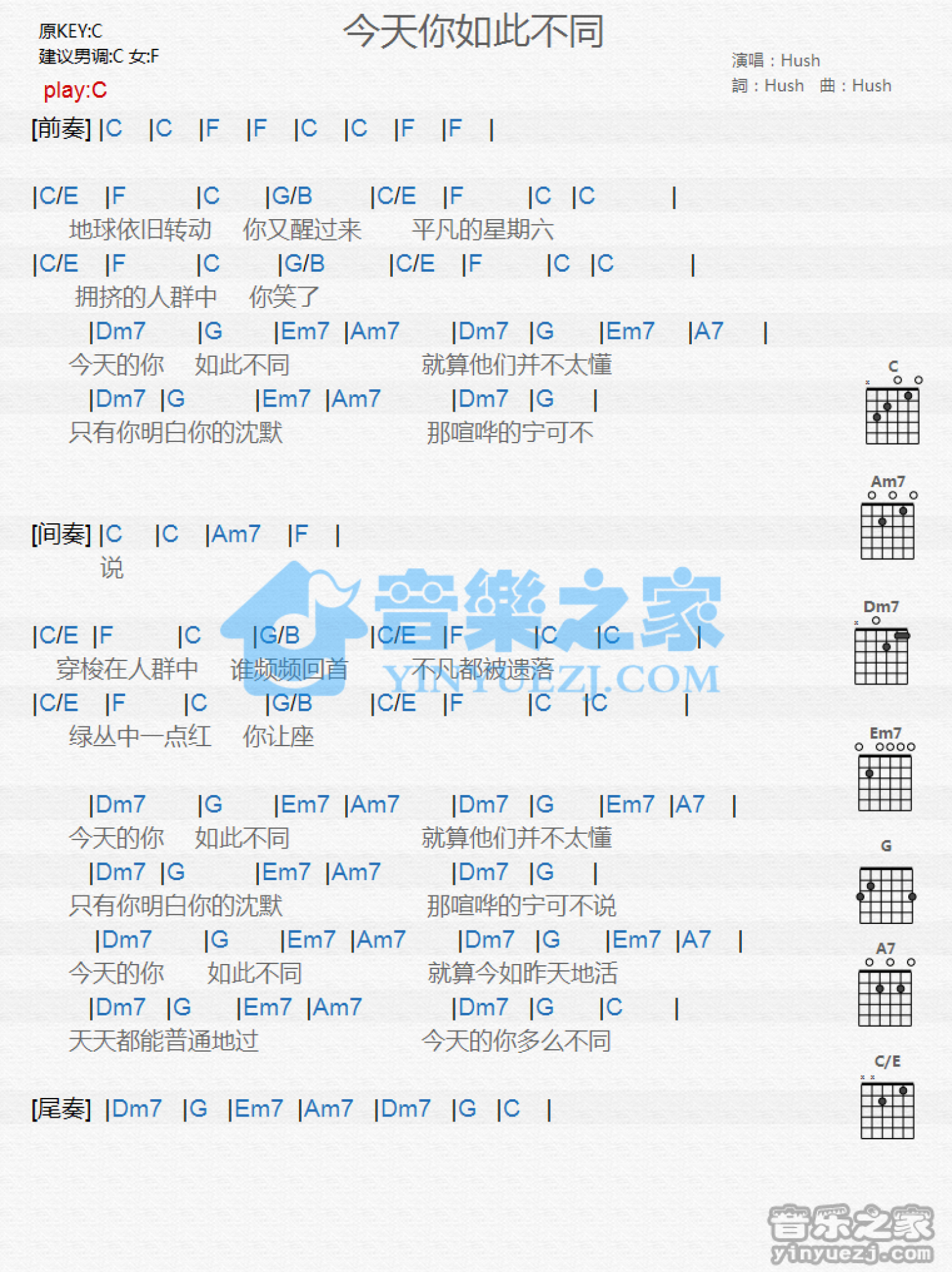 今天你如此不同吉他谱 - Hush - C调吉他弹唱谱 - 和弦谱