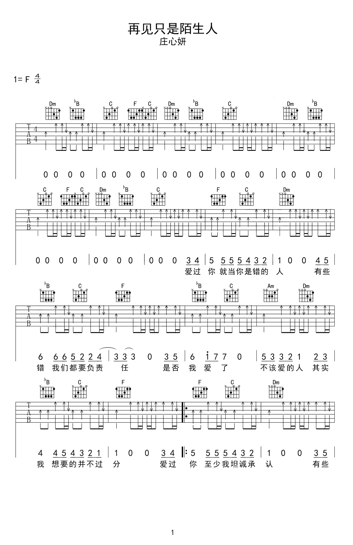 再见只是陌生人吉他谱 - 庄心妍 - F调吉他弹唱谱