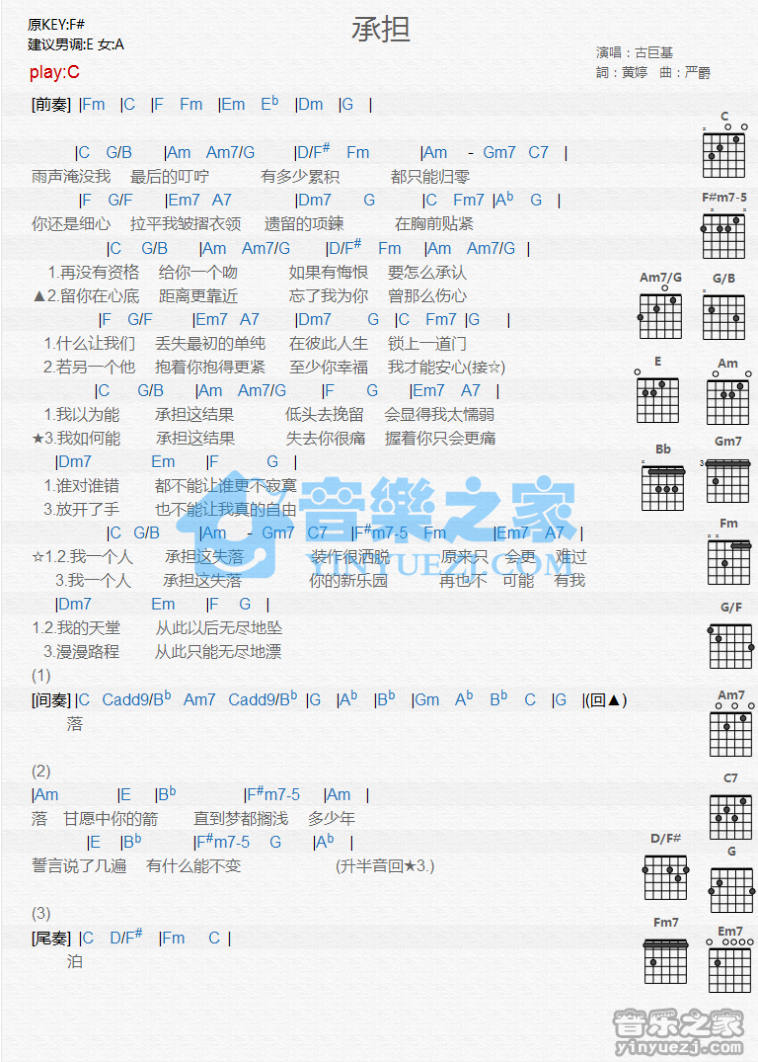 曲谱介绍: C调版《承担》吉他和弦弹唱谱