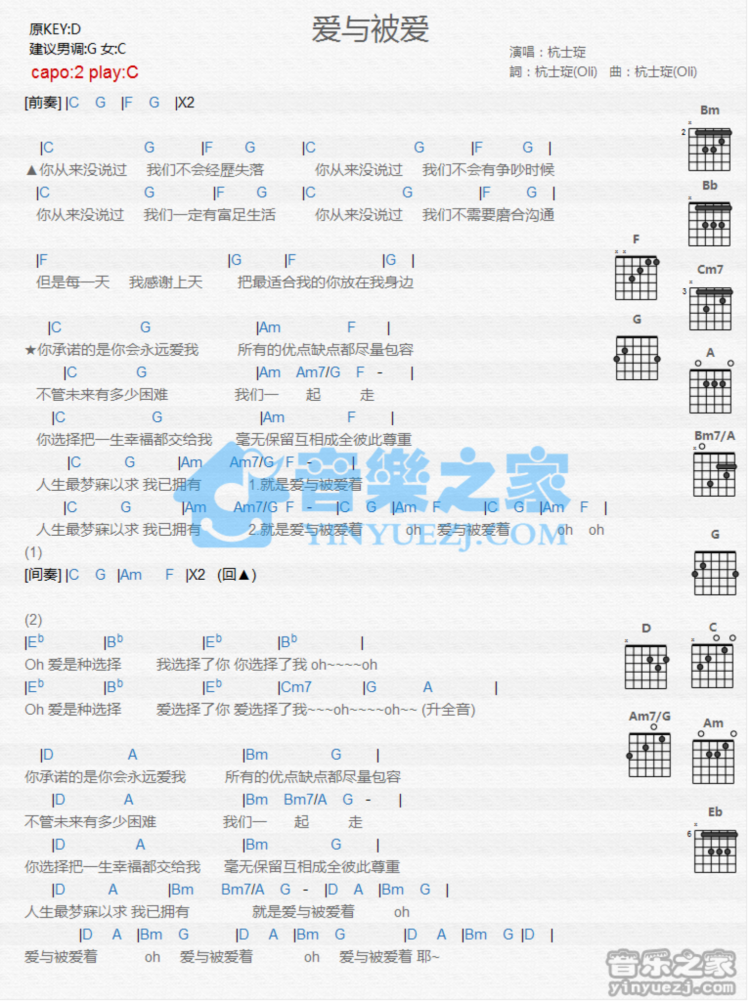 曲谱介绍: C调版杭士琁《爱与被爱》吉他和弦弹唱谱