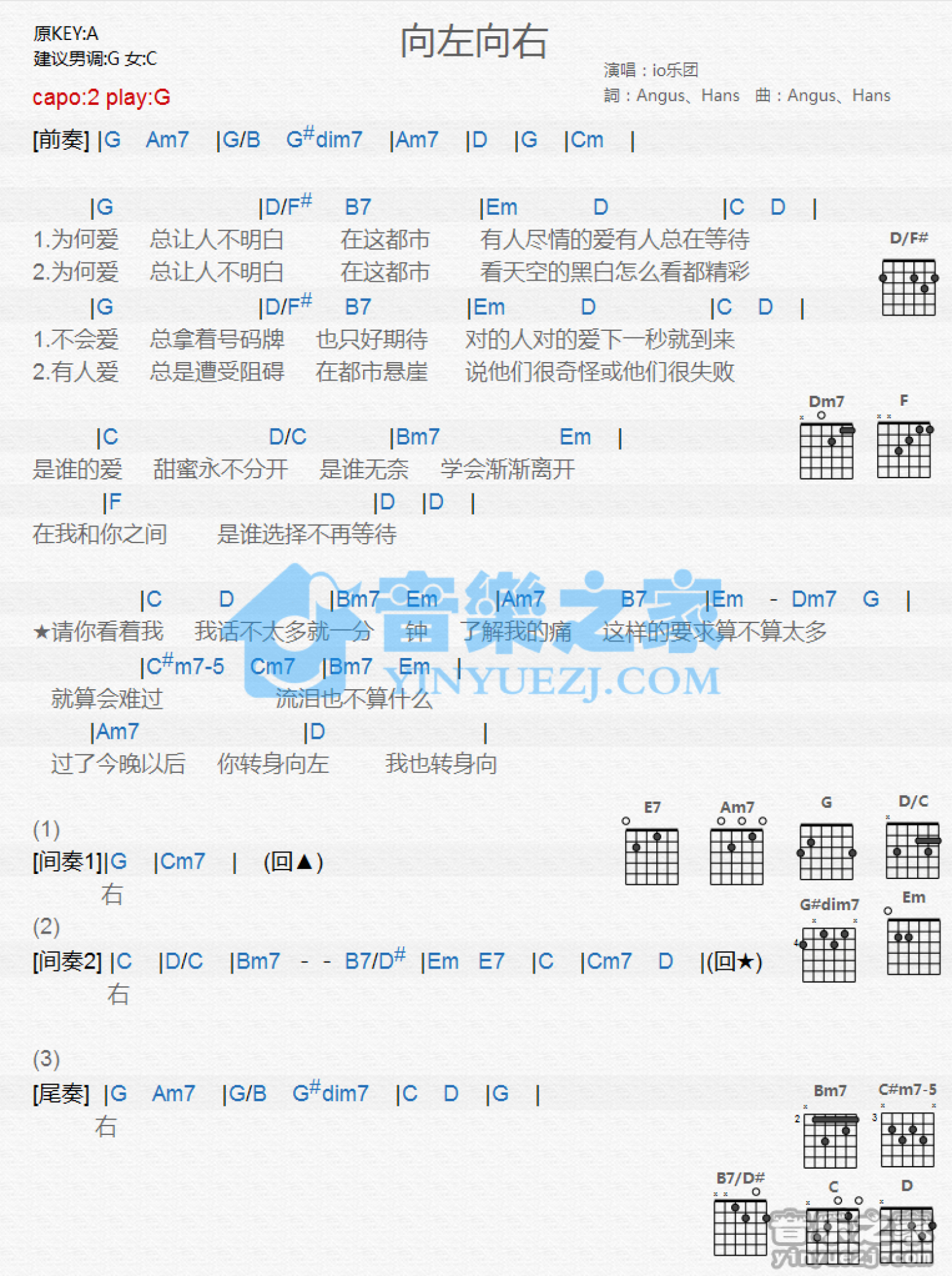 向左向右吉他谱 - io乐团 - G调吉他弹唱谱 - 和弦谱
