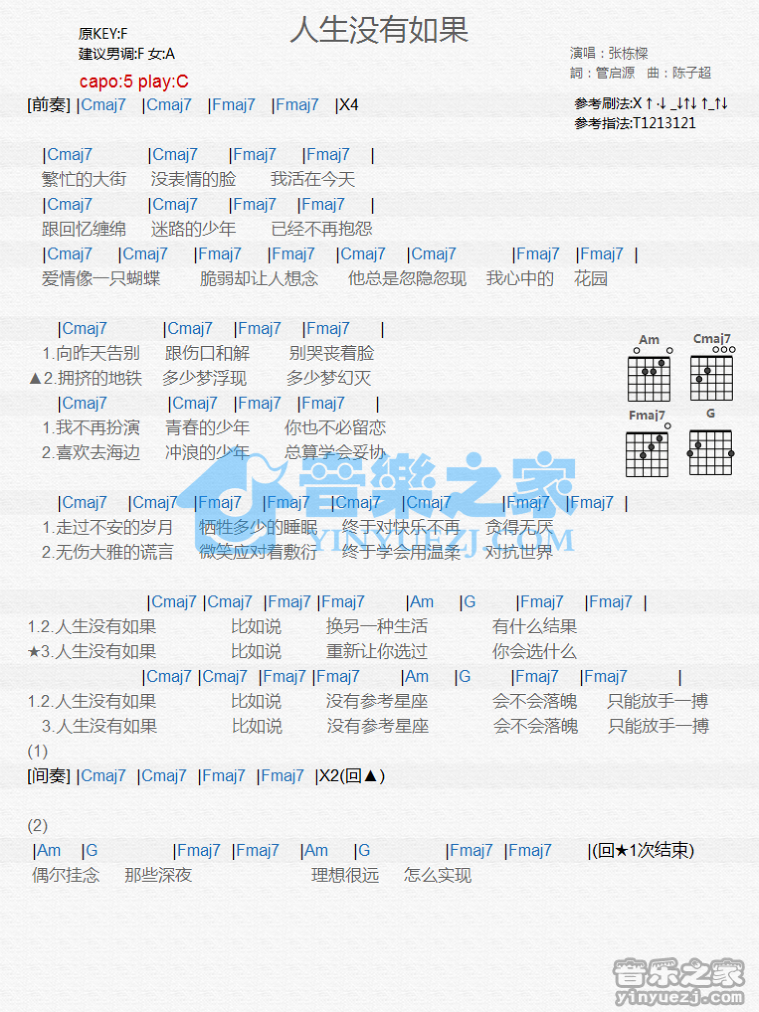 曲谱介绍: C调版《人生没有如果》吉他和弦弹唱谱