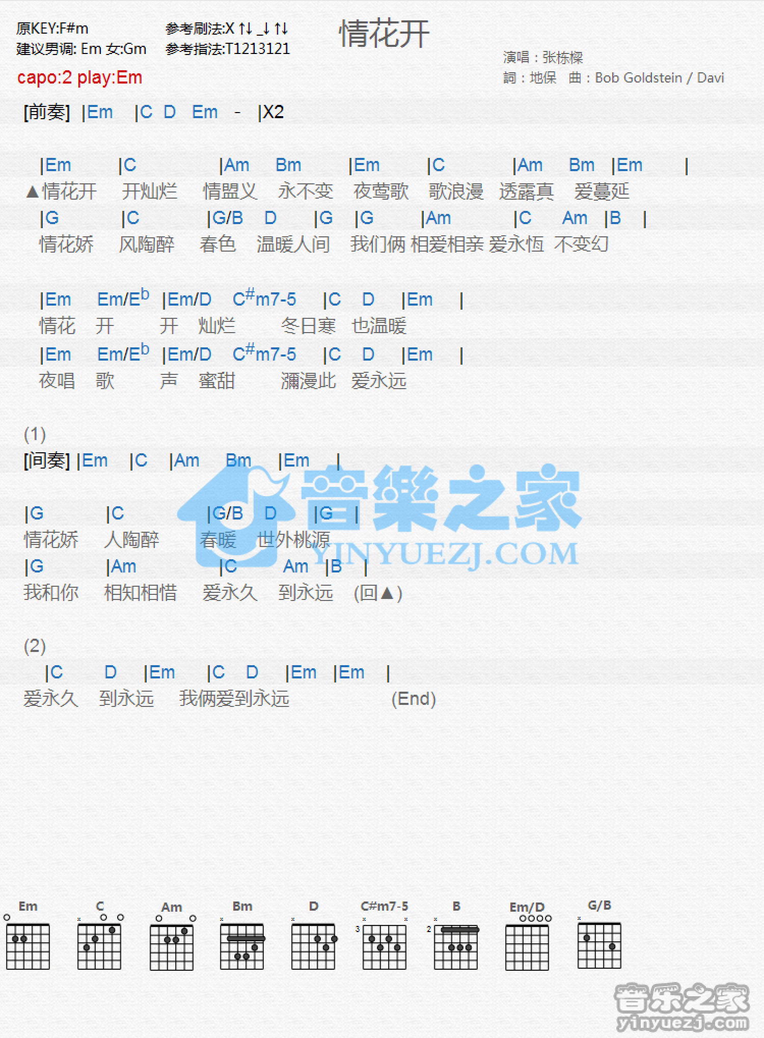 曲谱介绍: Em调版《情花开》吉他和弦弹唱谱