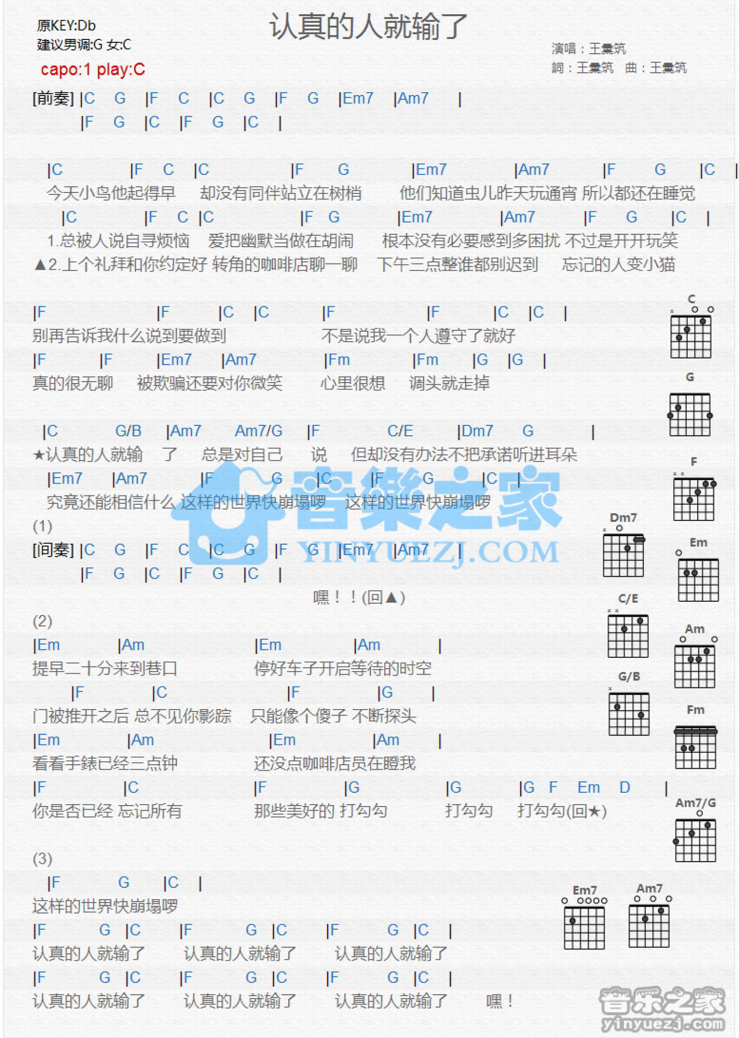 认真的人就输了吉他谱 - 王汇筑 - C调吉他弹唱谱 - 和弦谱