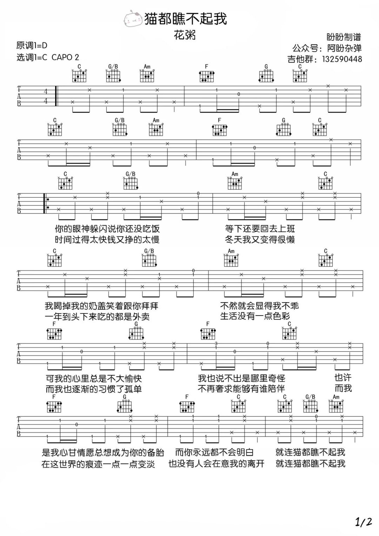 曲谱介绍: 花粥《猫都瞧不起我》吉他弹唱谱_高清六线谱