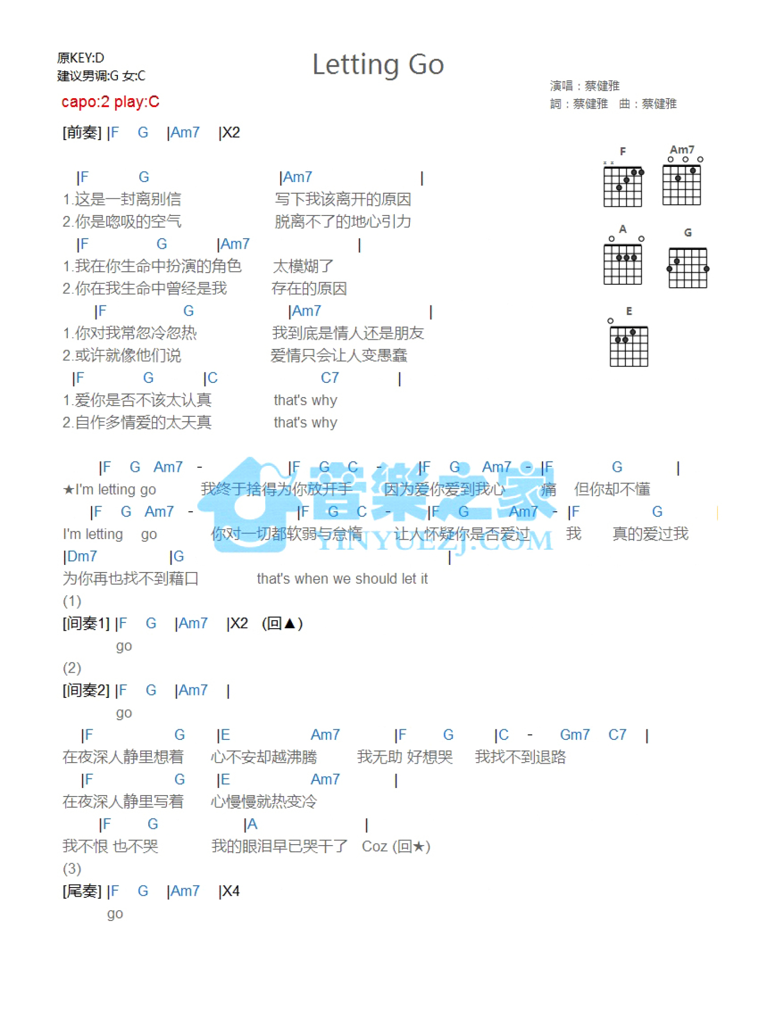 Letting Go吉他谱 - 蔡健雅 - C调吉他弹唱谱 - 和弦谱
