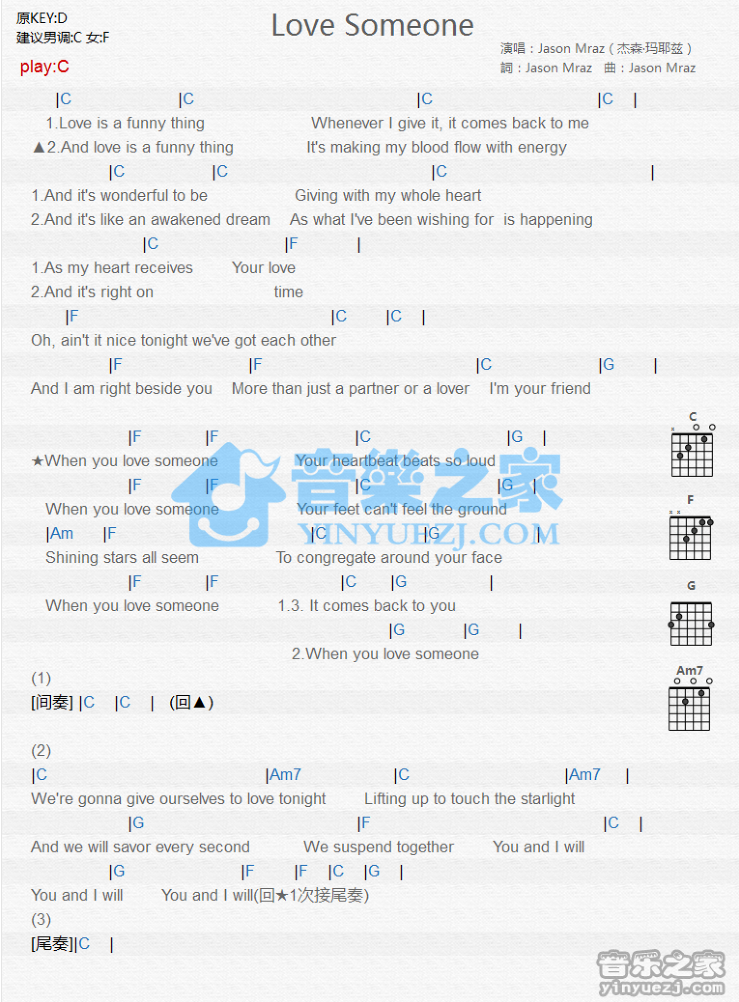 Love Someone吉他谱 - JasonMraz - C调吉他弹唱谱 - 和弦谱