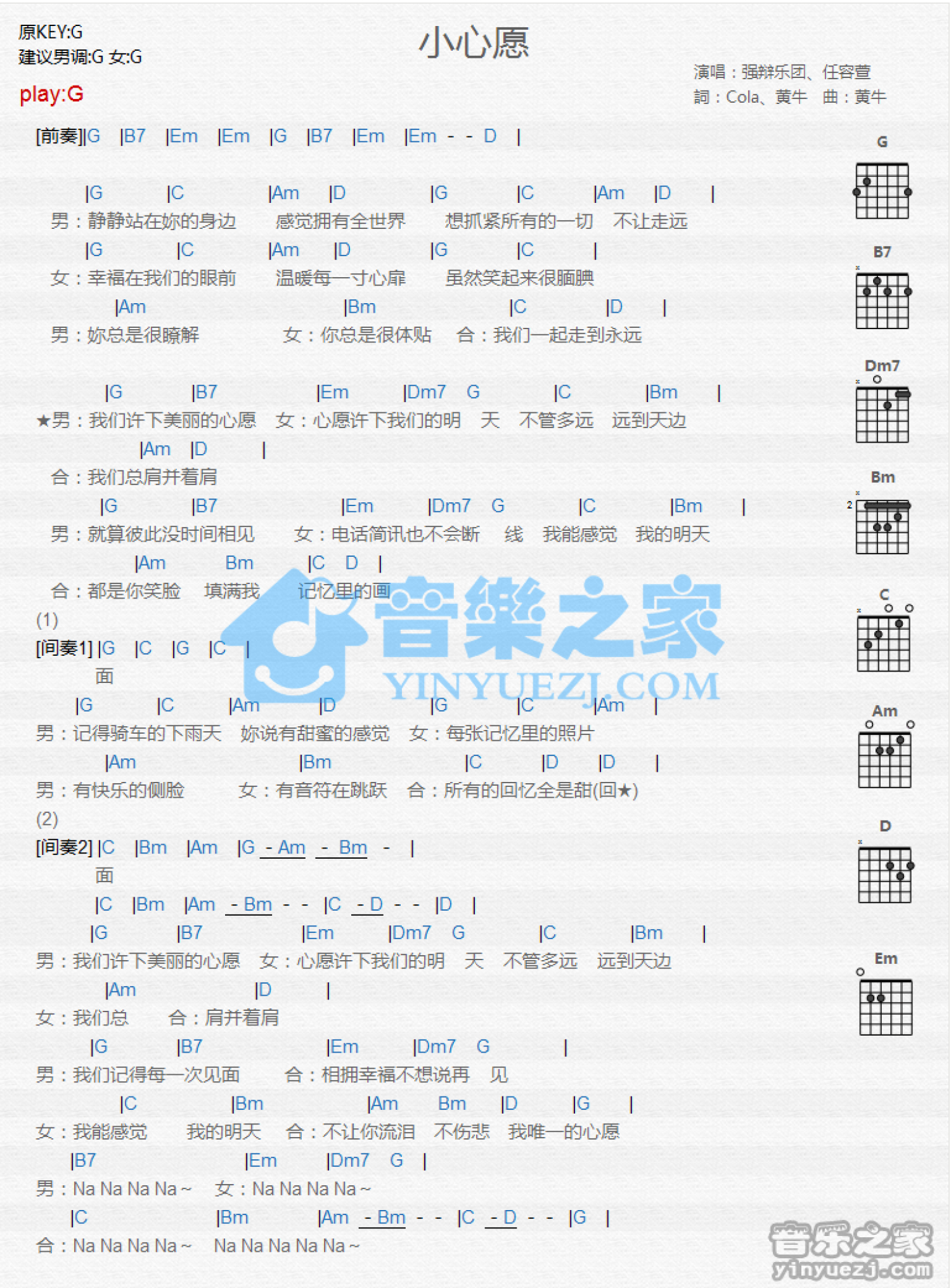 曲谱介绍: G调版《小心愿》吉他和弦弹唱谱