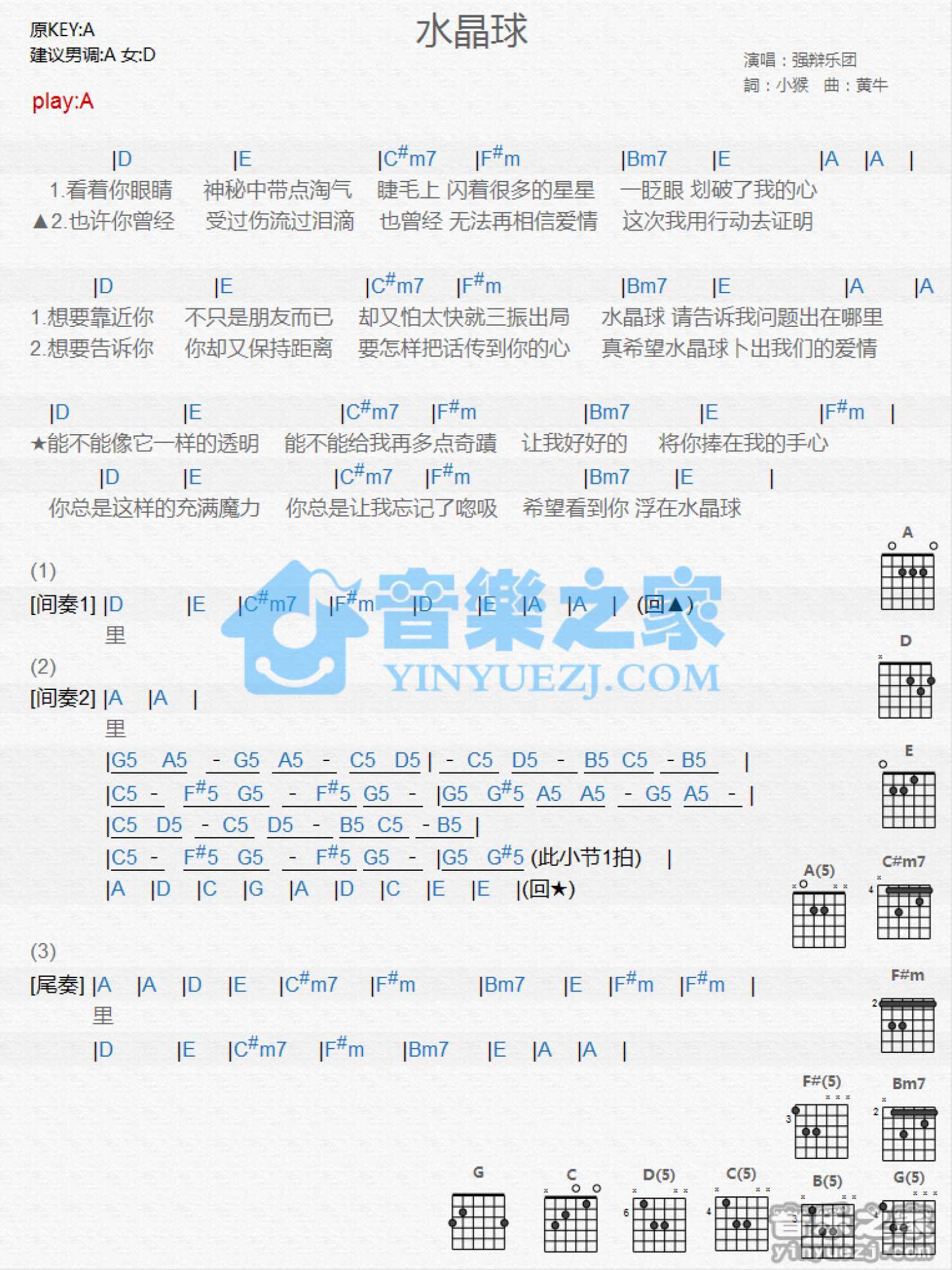 曲谱介绍: A调版《水晶球》吉他和弦弹唱谱