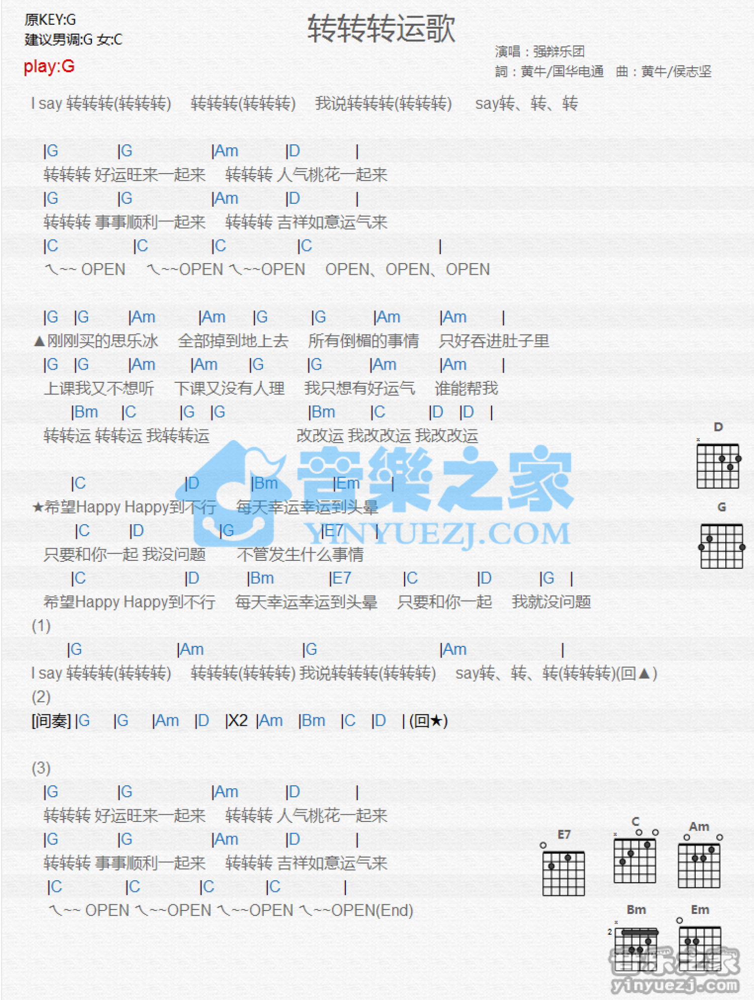 转转转运歌吉他谱 - 强辩乐团 - G调吉他弹唱谱 - 和弦谱