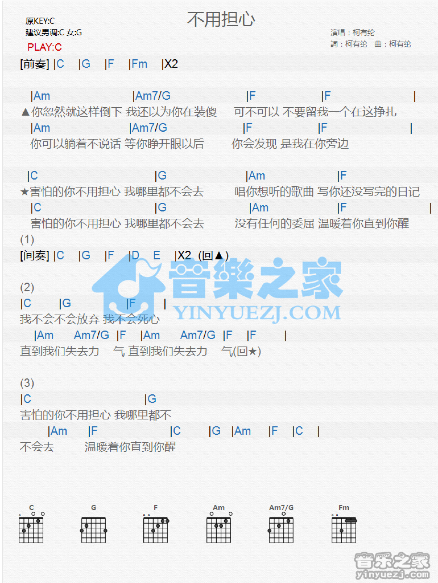 不用担心吉他谱 - 柯有伦 - C调吉他弹唱谱 - 和弦谱
