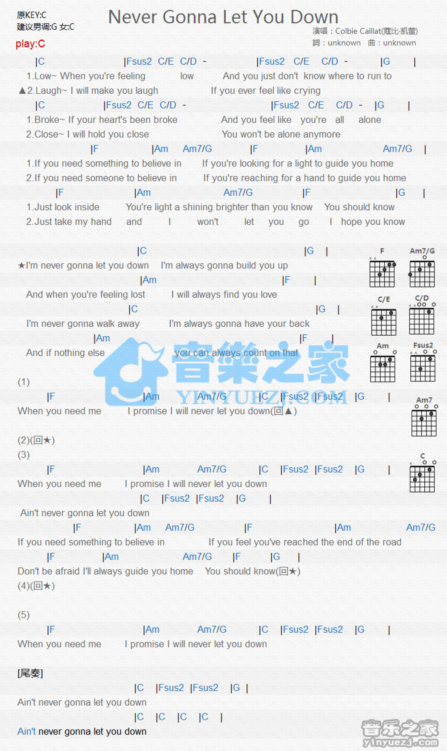 曲谱介绍: C调版 Colbie Caillat《Never Gonna Let You Down》吉他和弦弹唱谱
