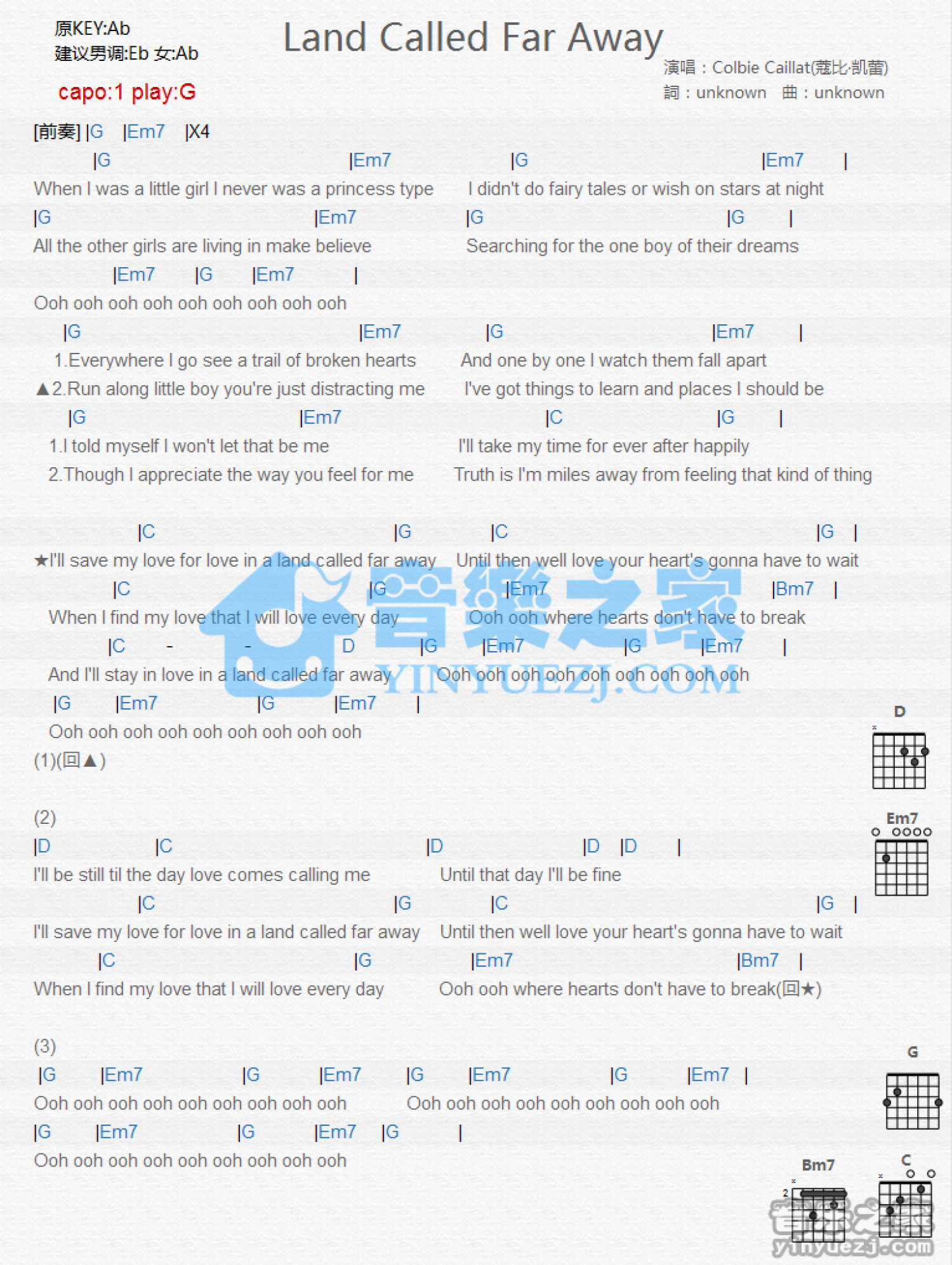 曲谱介绍: G调版 Colbie Caillat《Land Called Far Away》吉他和弦弹唱谱