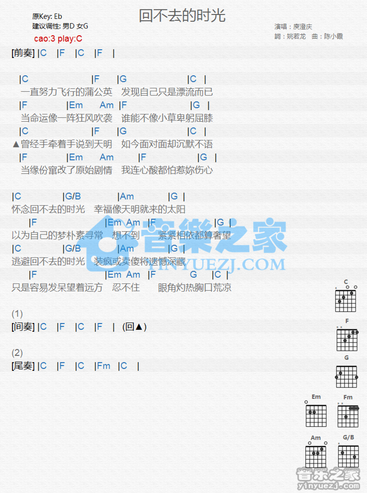 曲谱介绍: C调版 庾澄庆《回不去的时光》吉他和弦弹唱谱