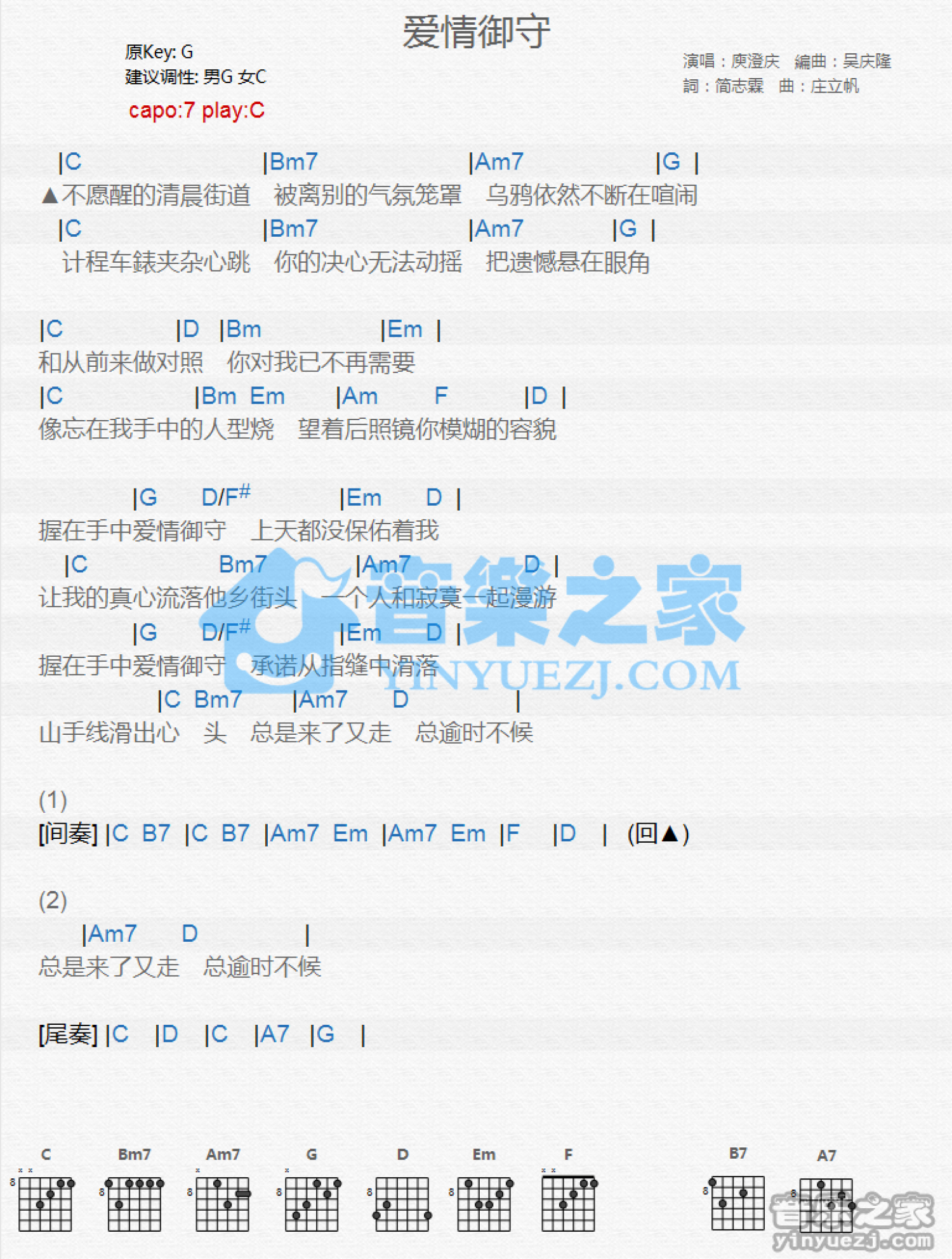 曲谱介绍: C调版 庾澄庆《爱情御守》吉他和弦弹唱谱
