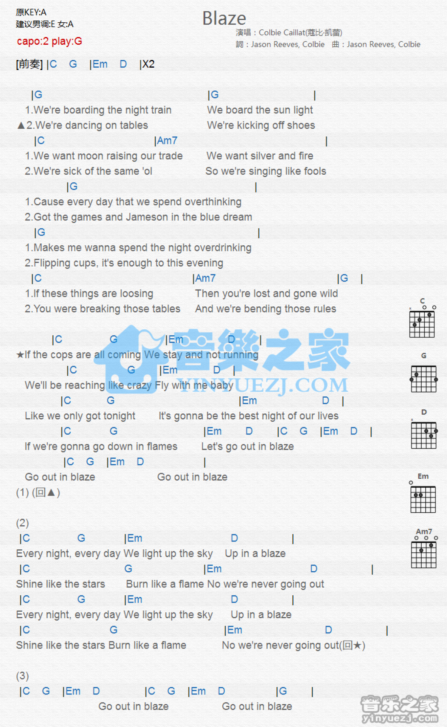 曲谱介绍: G调版 Colbie Caillat《Blaze》吉他和弦弹唱谱