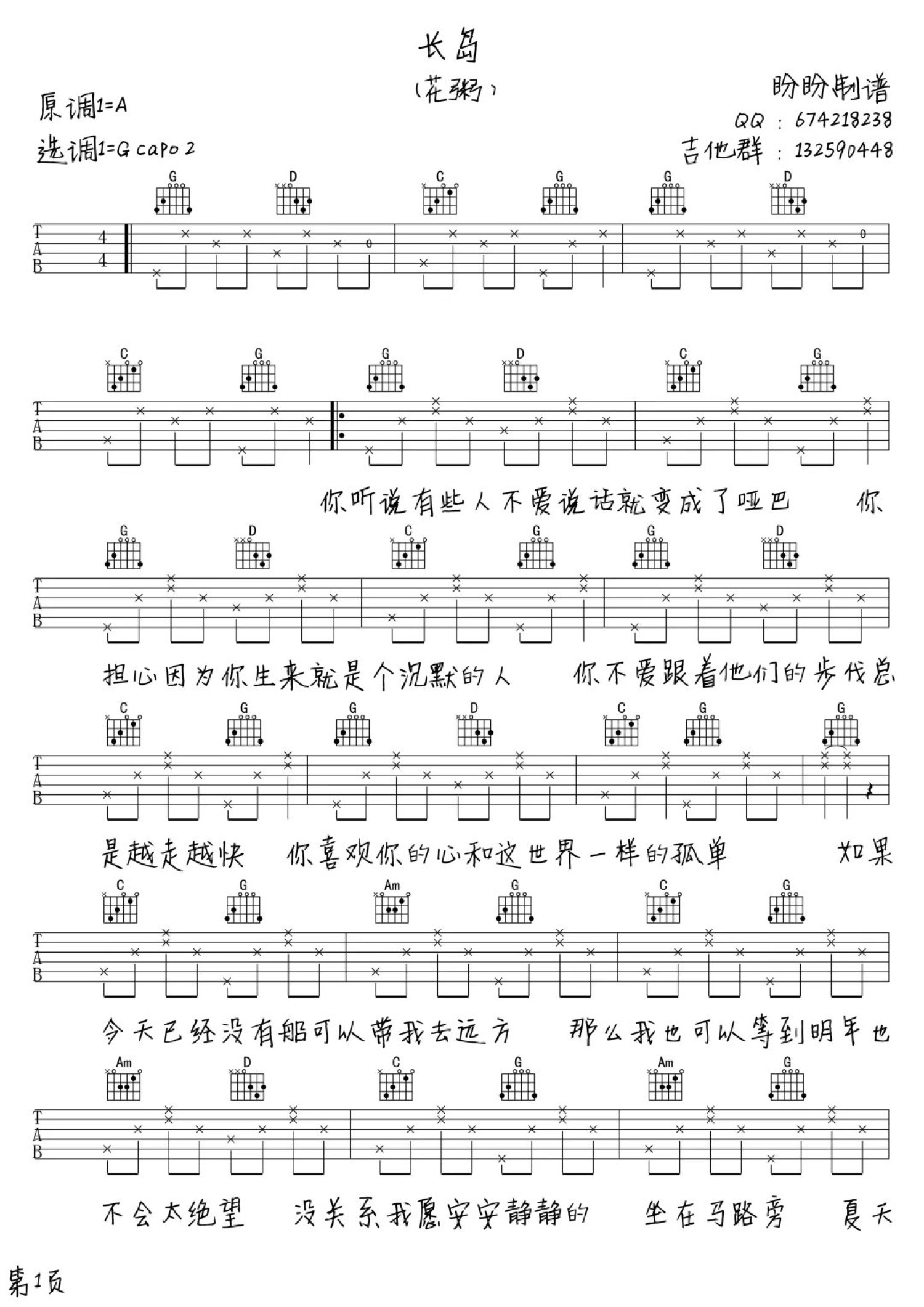 长岛吉他谱 - 花粥 - G调吉他弹唱谱