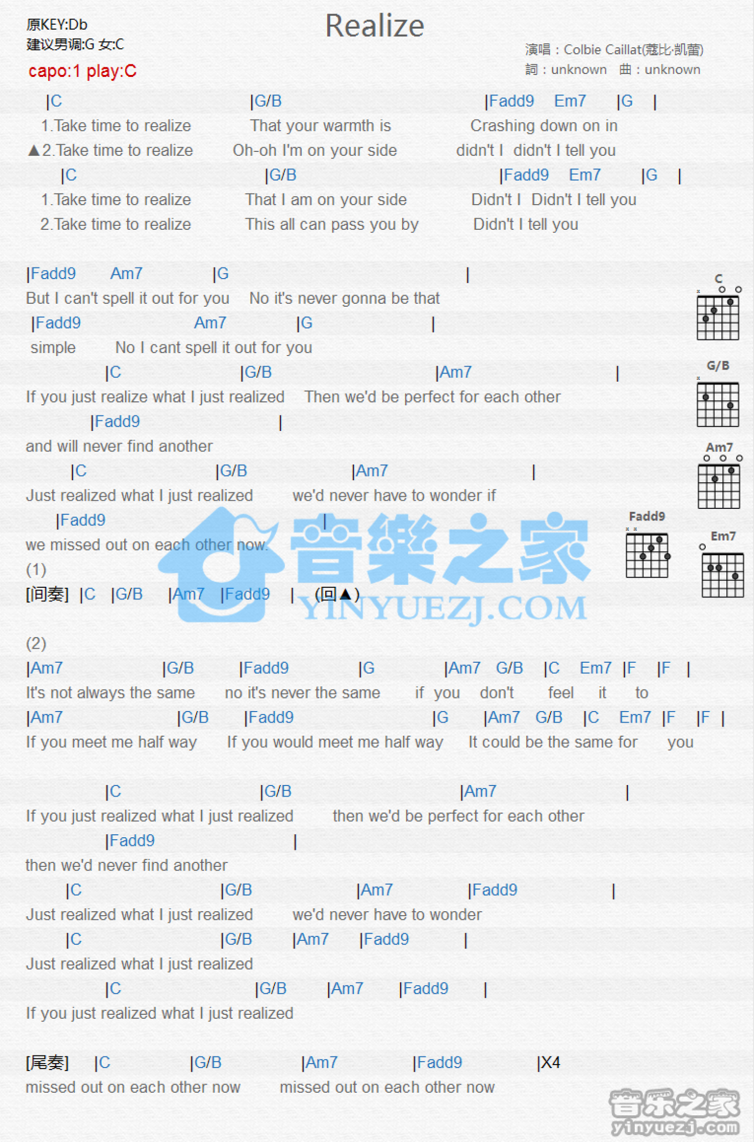 曲谱介绍: C调版 Colbie Caillat《Realize》吉他和弦弹唱谱