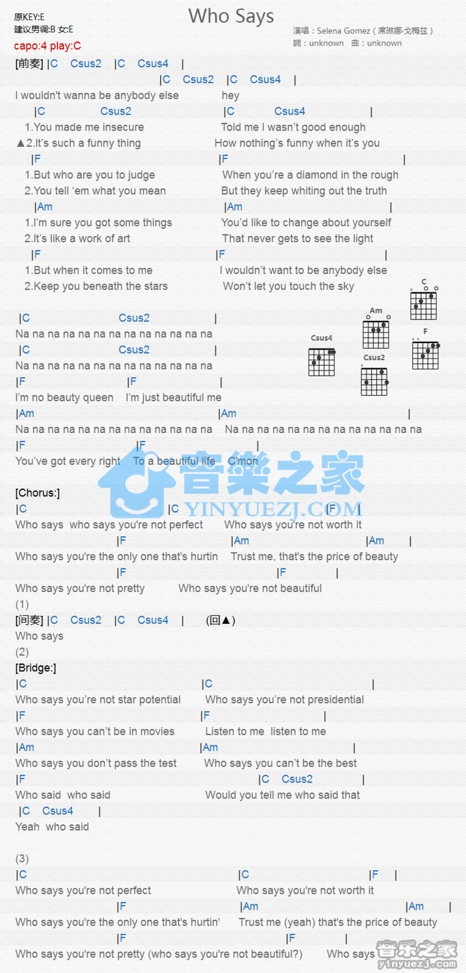曲谱介绍: C调版 Selena Gomez《Who Says》吉他和弦弹唱谱