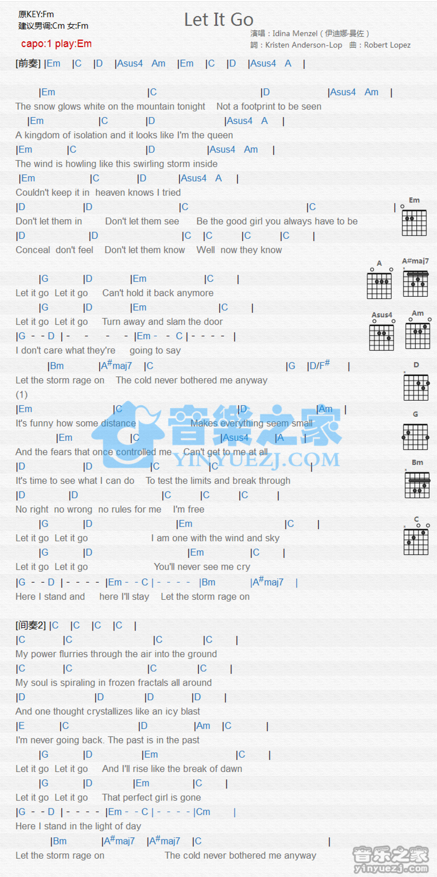 曲谱介绍: Em调版《LetItGo》吉他和弦弹唱谱