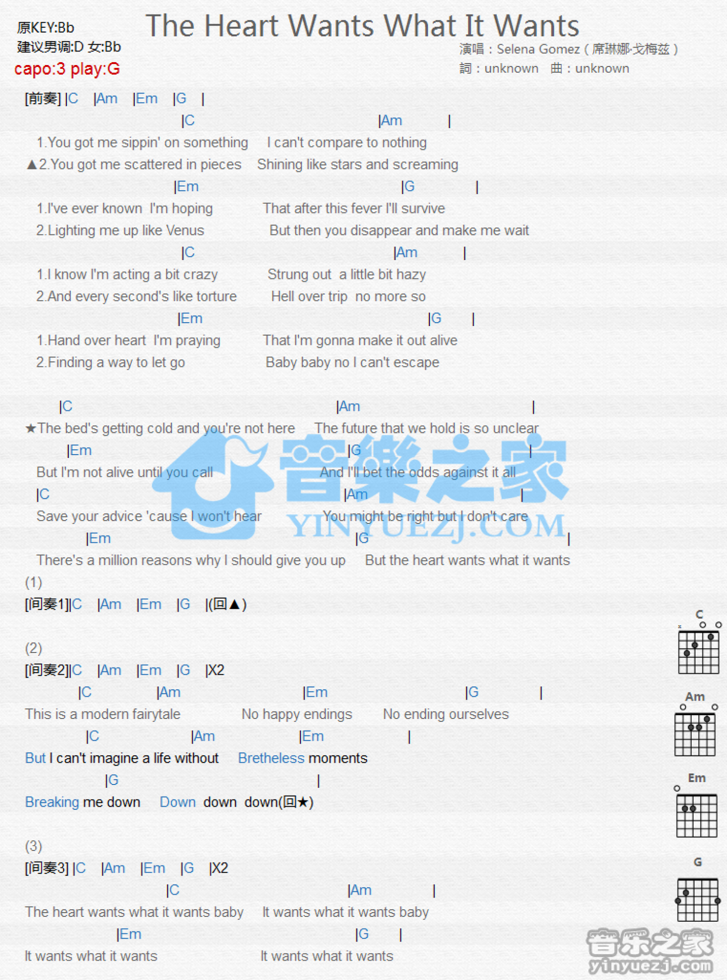 曲谱介绍: G调版 《The Heart Wants What It Wants》吉他和弦弹唱谱