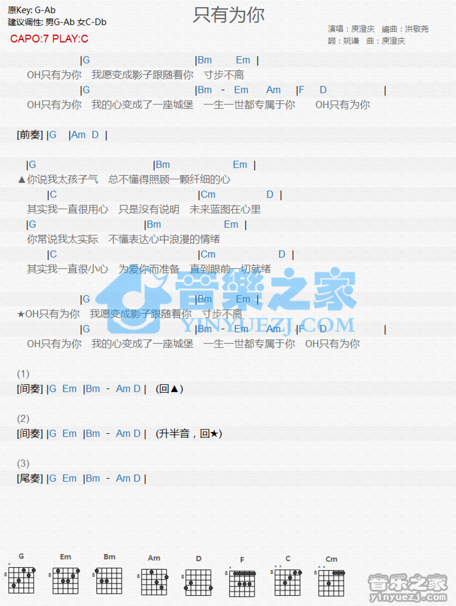 曲谱介绍: C调版 庾澄庆《只有为你》吉他和弦弹唱谱