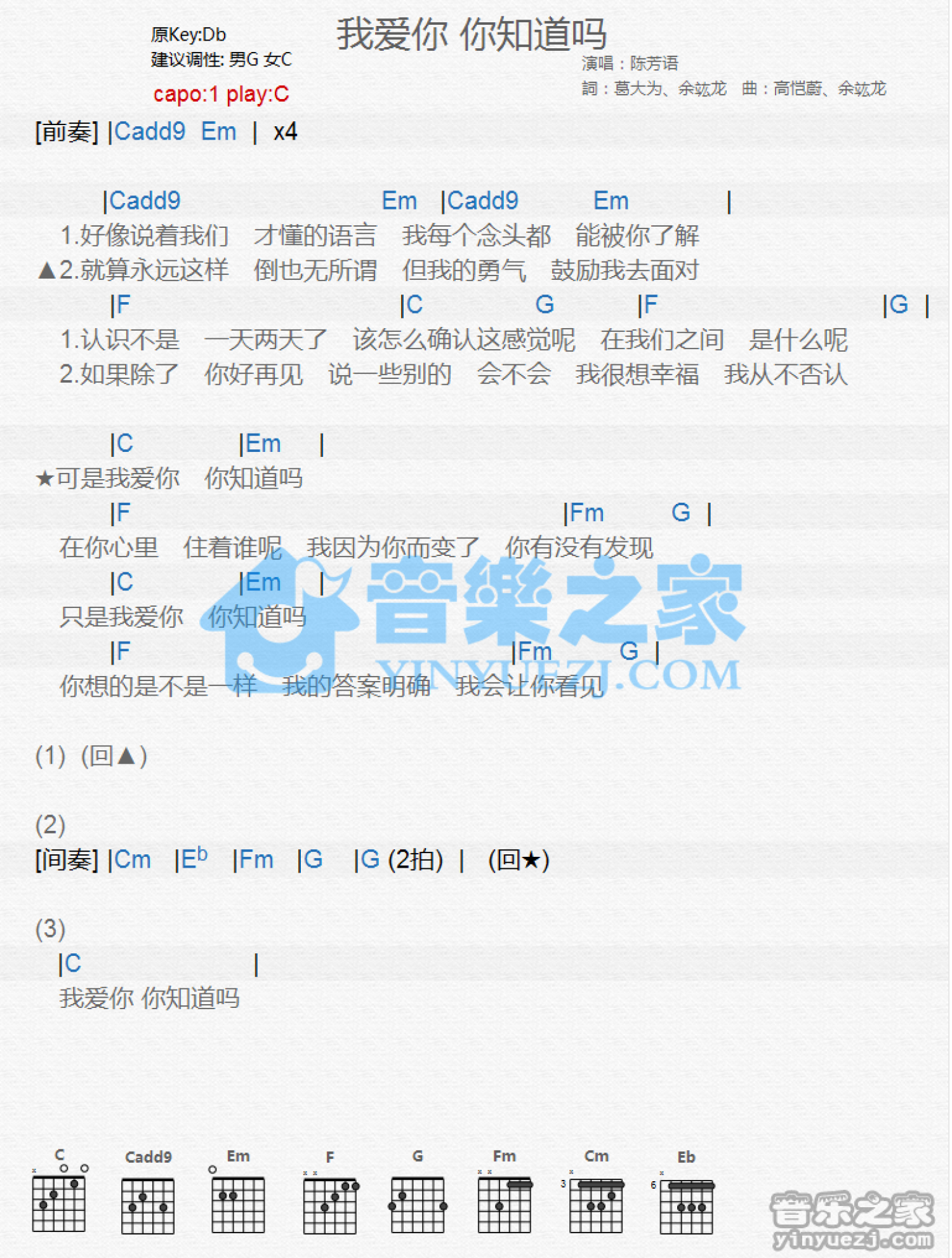 曲谱介绍: C调版 陈芳语《我爱你你知道吗》吉他和弦弹唱谱