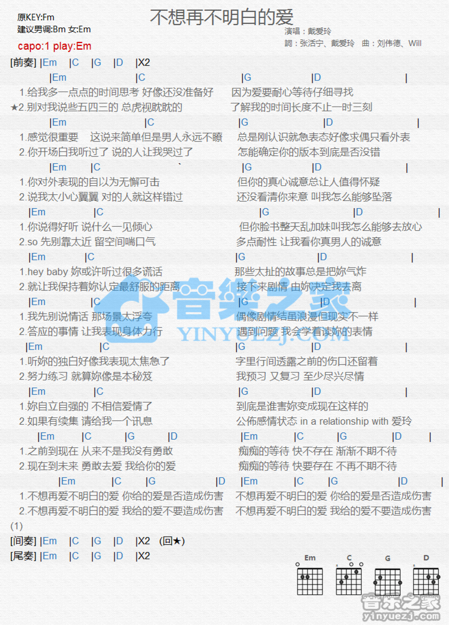 曲谱介绍: Em调版 戴爱玲《不想再不明白的爱》吉他和弦弹唱谱